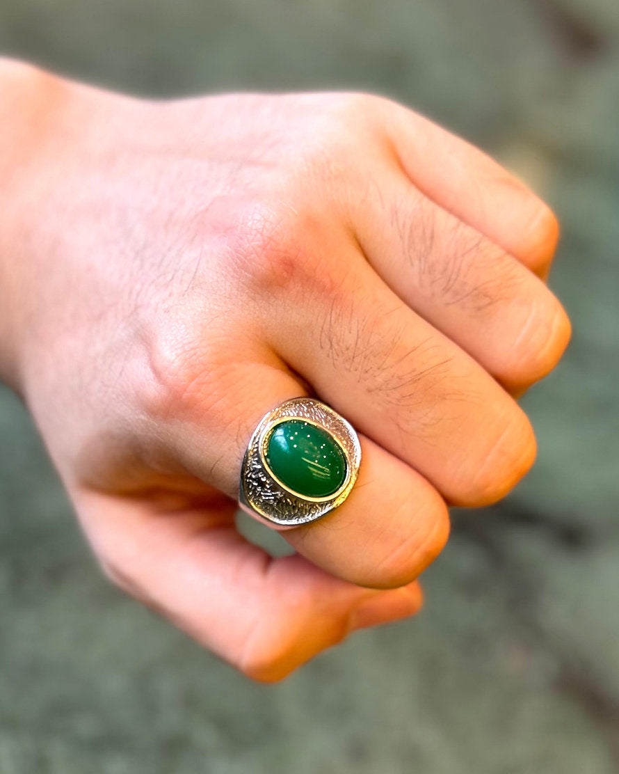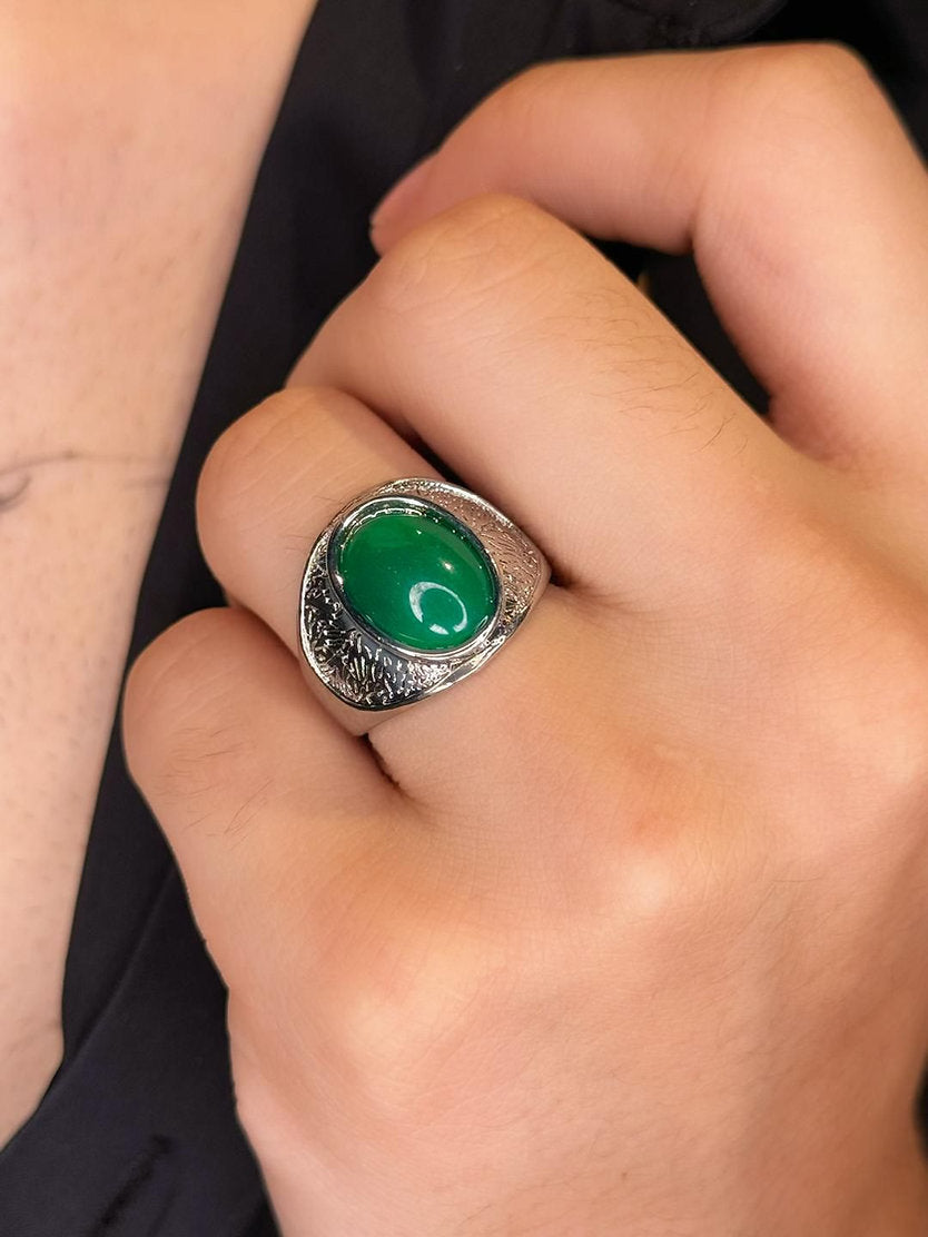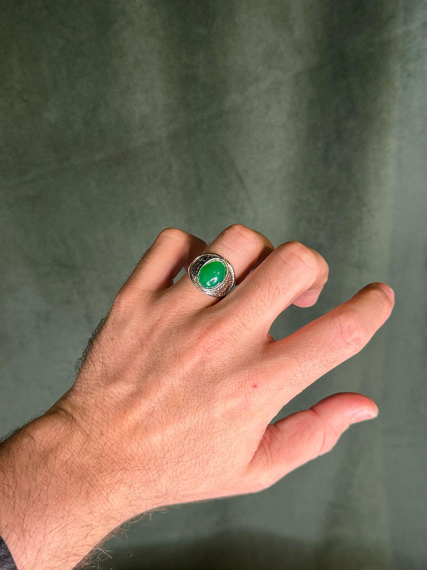 Anel ajustável banhado em ródio (prateado), cravejado em pedra resinada verde.
