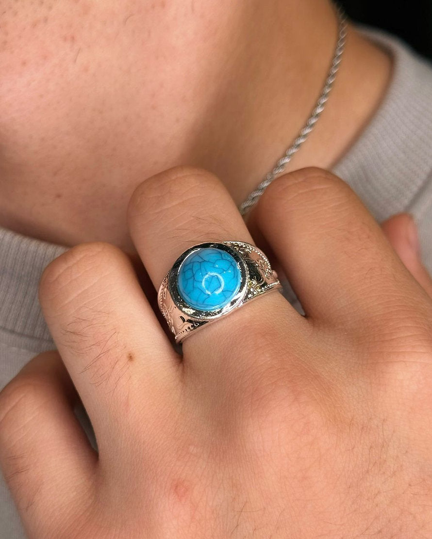 Anel banhado em ródio (prateado) e cravejado com pedra resinada na cor turquesa.