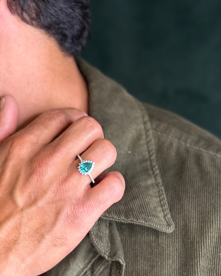 Anel banhado em ródio (prateado) e cravejado com zircônias de primeira linha nas cores turmalina e cristal.