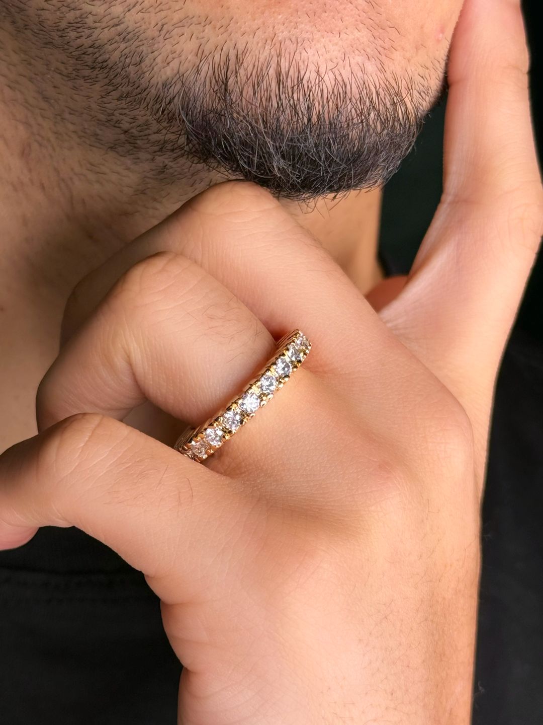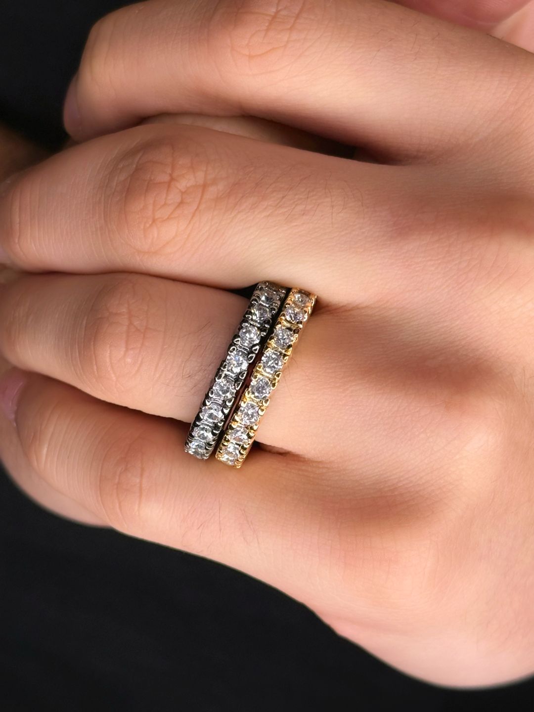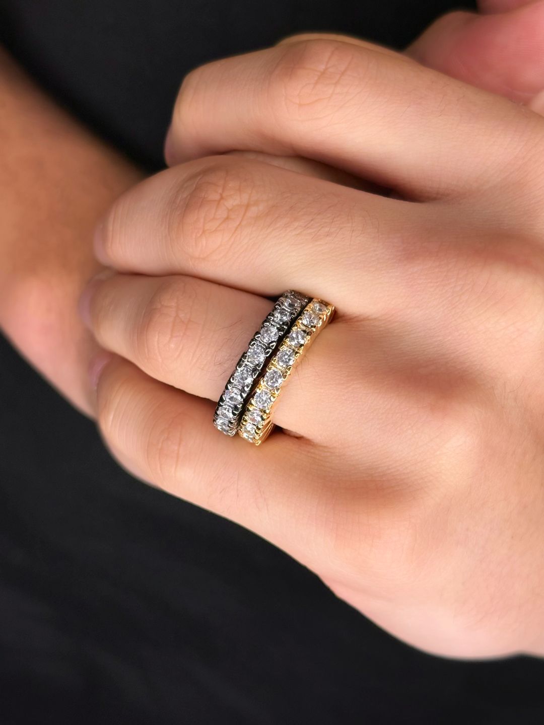 O Anel Lumiére é a definição de presença. Totalmente cravejado com zircônias na cor cristal, ele cria um efeito contínuo de luz ao redor de todo o dedo — um brilho intenso, moderno e impossível de ignorar.