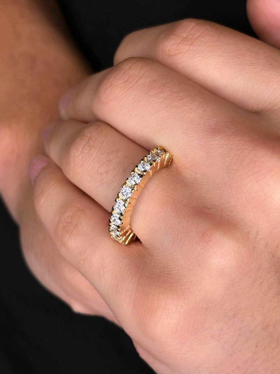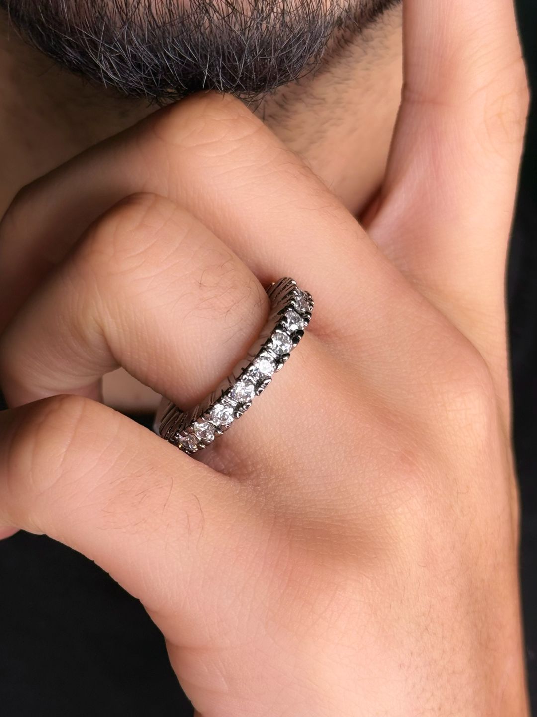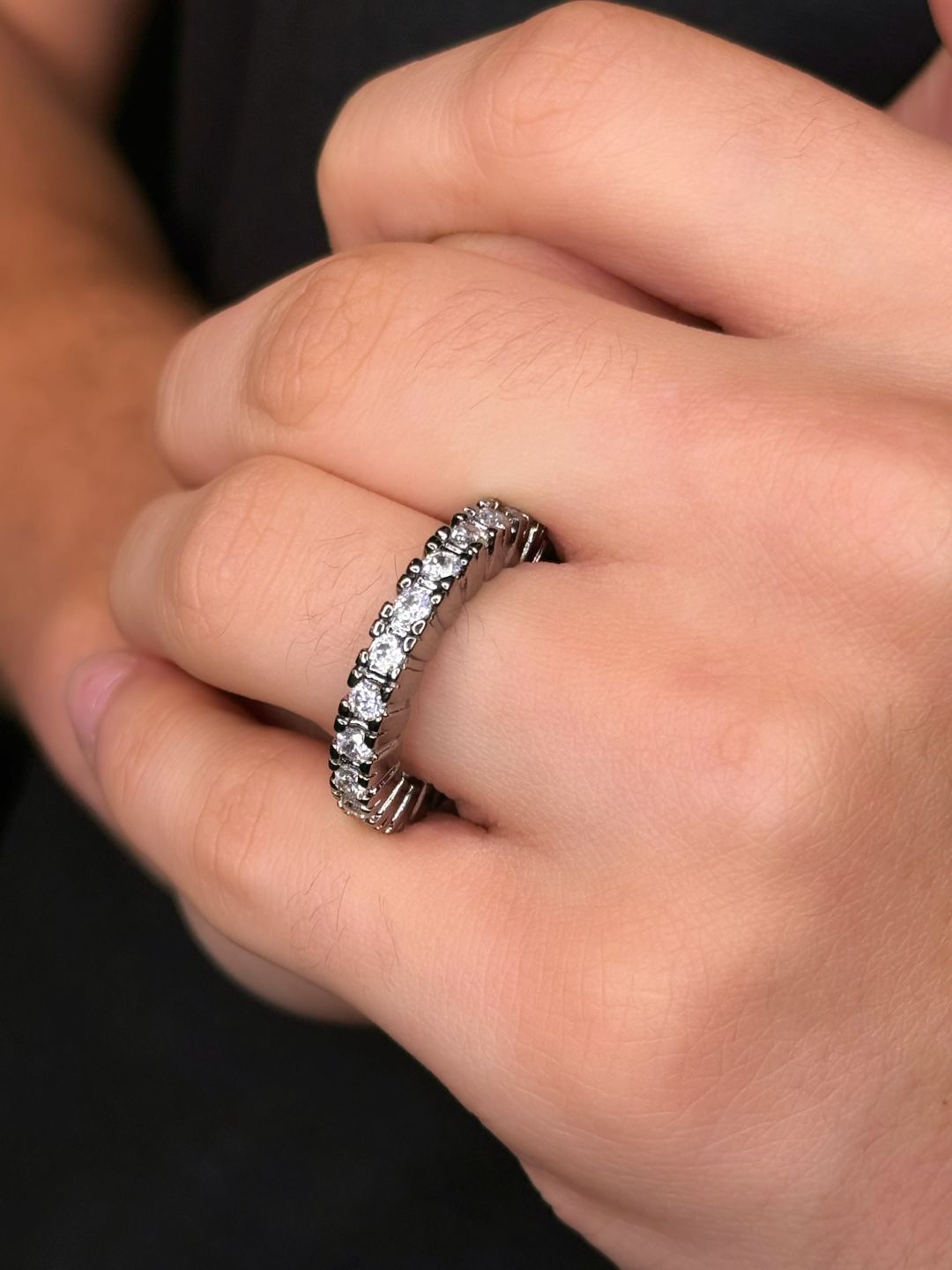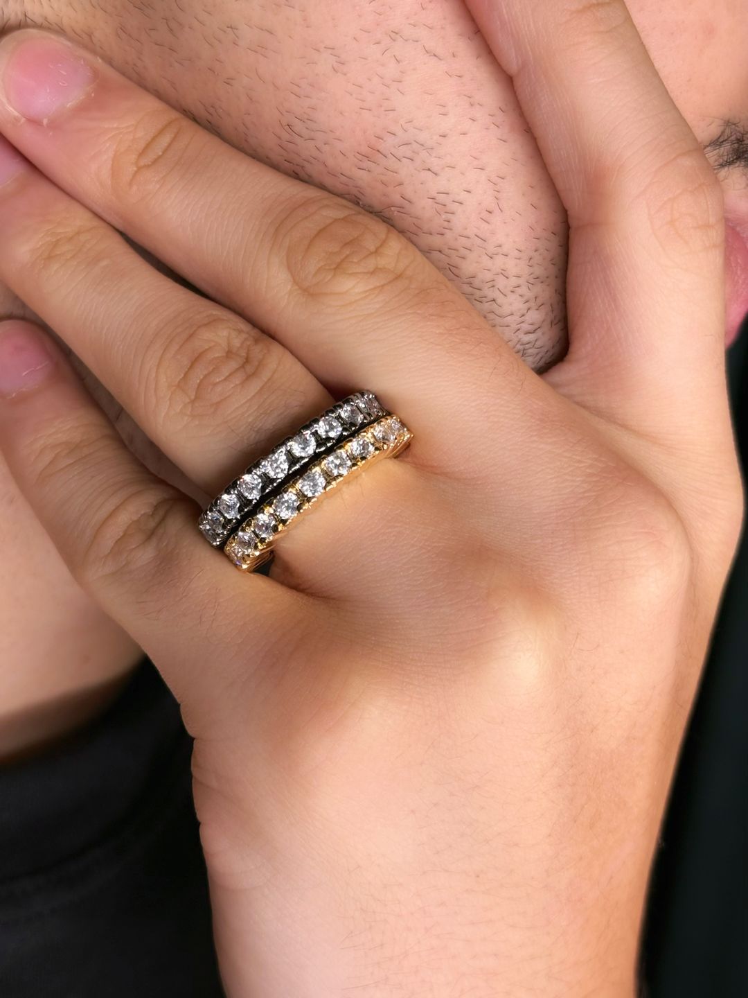 O Anel Lumiére é a definição de presença. Totalmente cravejado com zircônias na cor cristal, ele cria um efeito contínuo de luz ao redor de todo o dedo — um brilho intenso, moderno e impossível de ignorar.