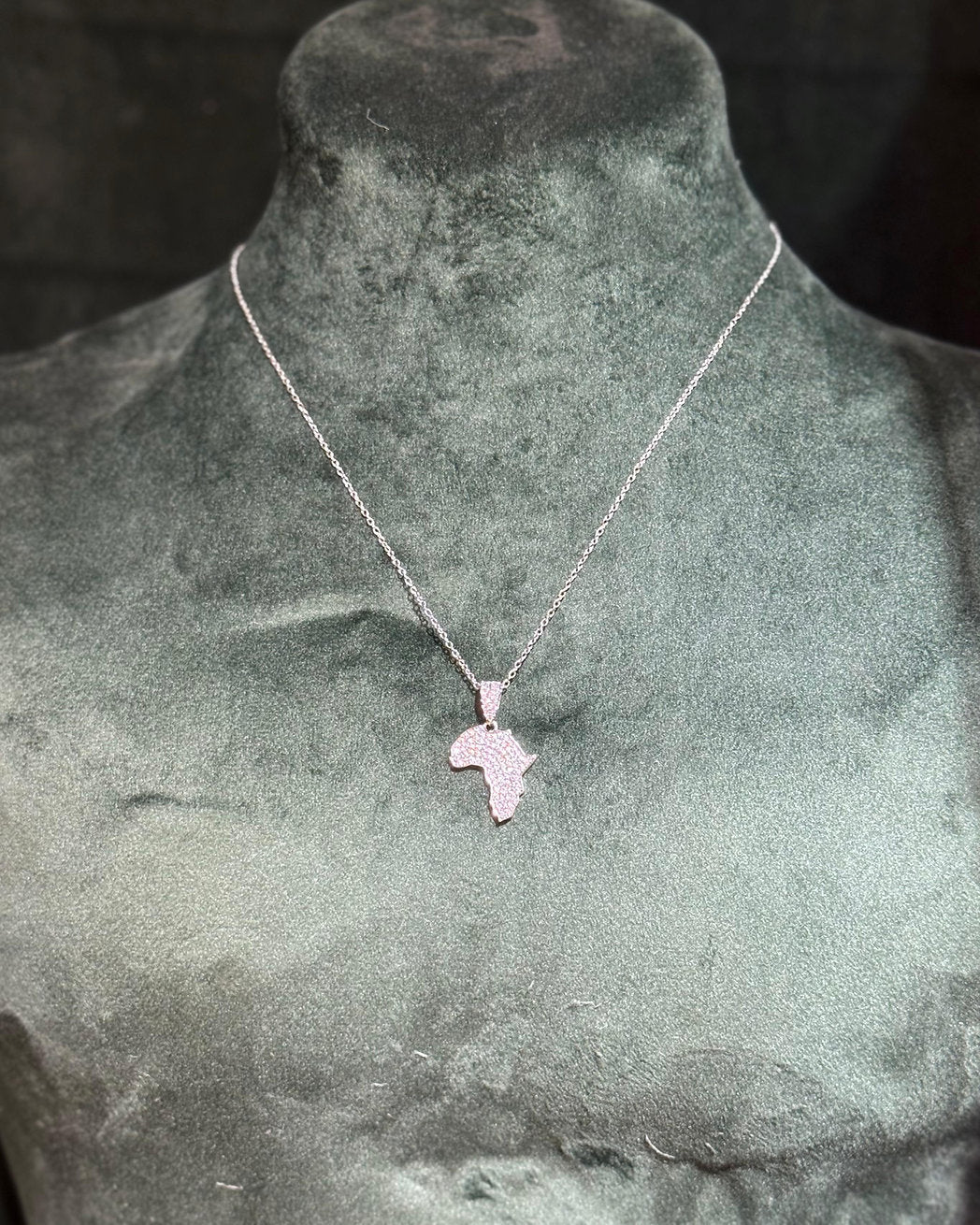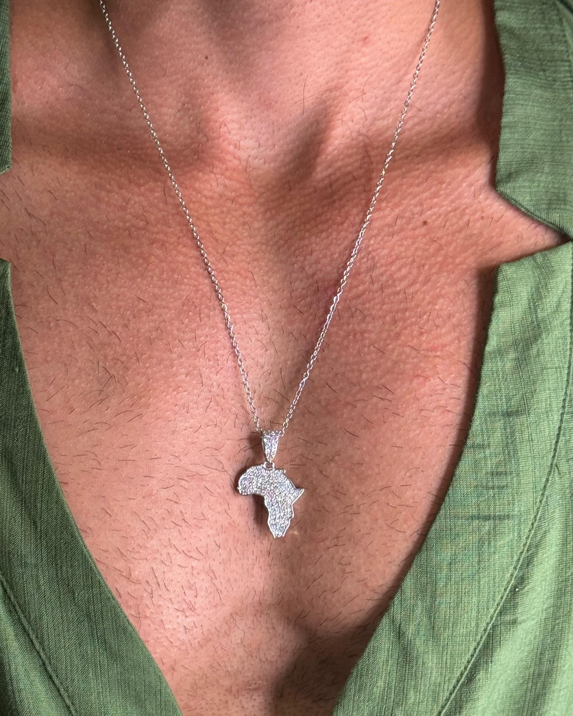 Corrente em aço inoxidavel que não muda de cor, de 60cm. Com pingente no formato da África, banhado em ródio e cravejado com zircônias na cor cristal.