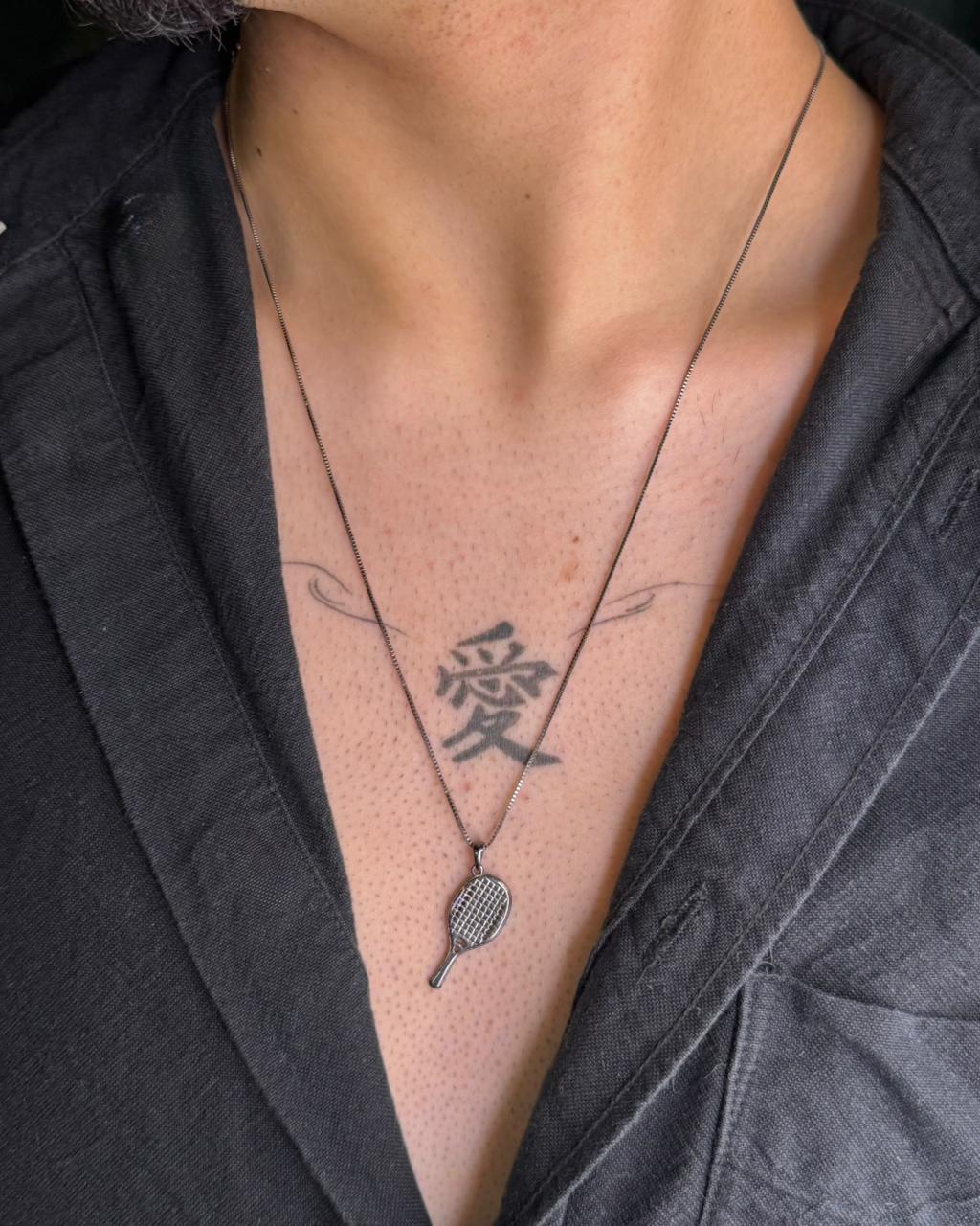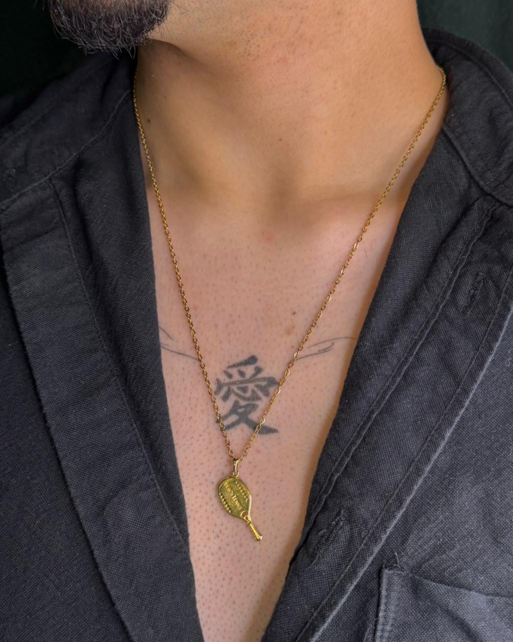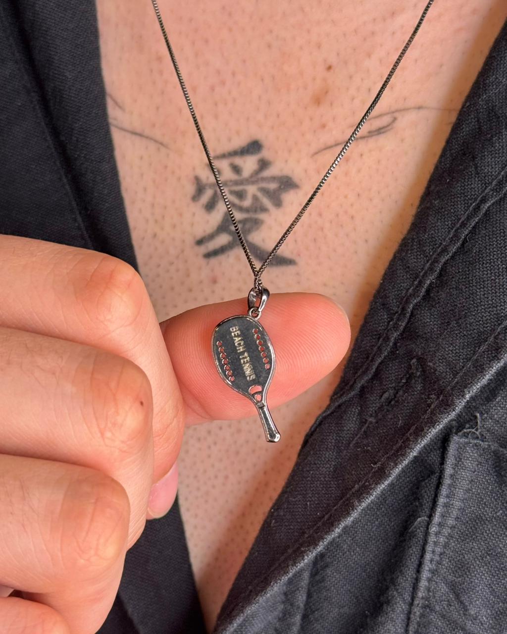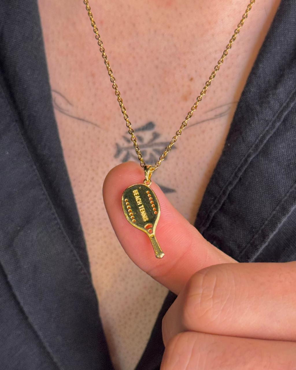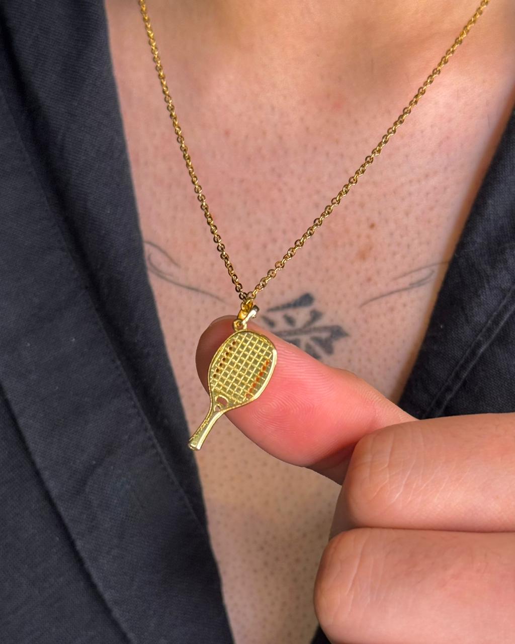 Colar em semijoia com pingente de raquete de tenis, disponível nos banhos de ouro 18k (dourado) e ródio negro (preto).