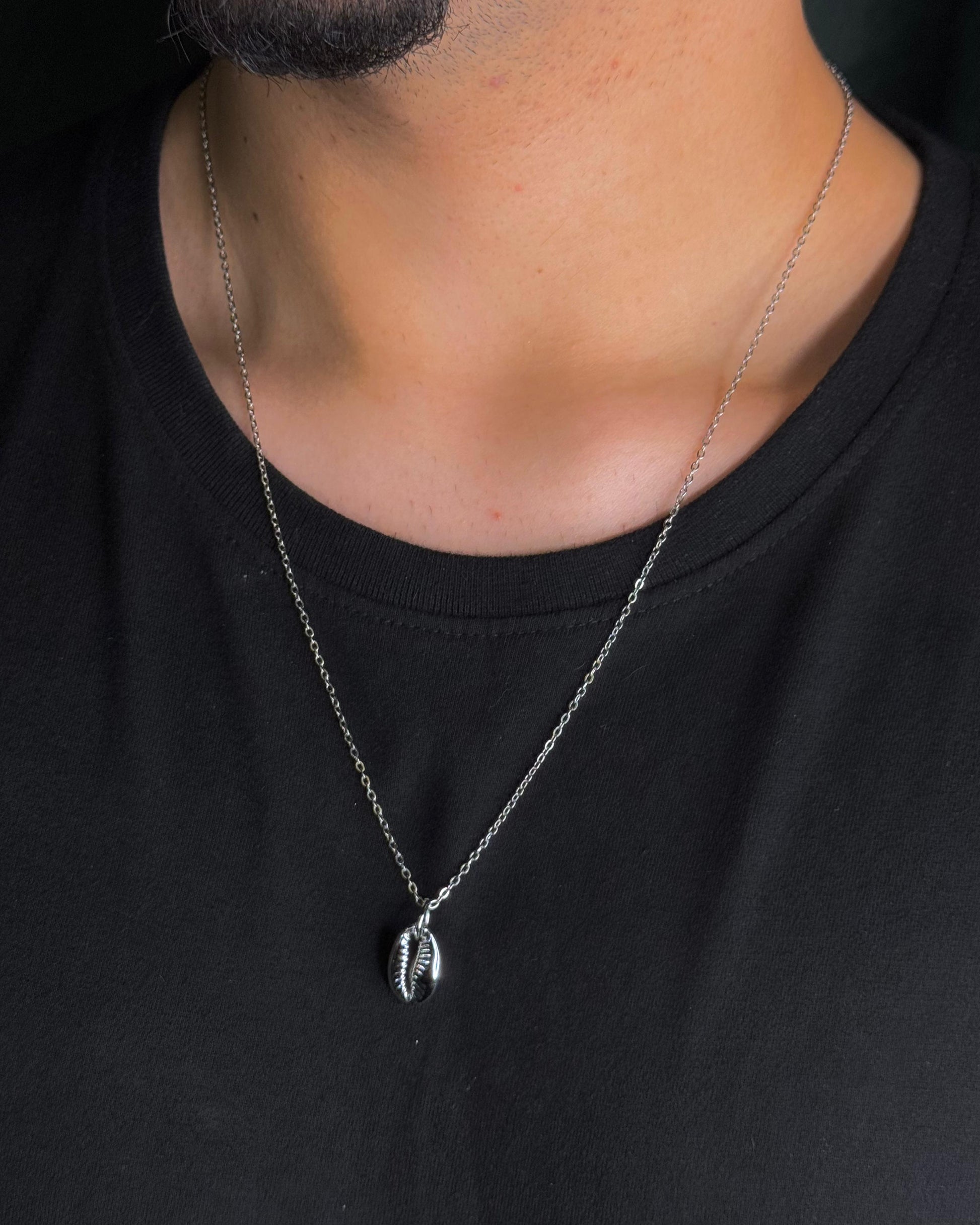 Colar com pingente de búzio banhado em ródio e corrente de 60cm em aço inoxidável que não muda de cor.
