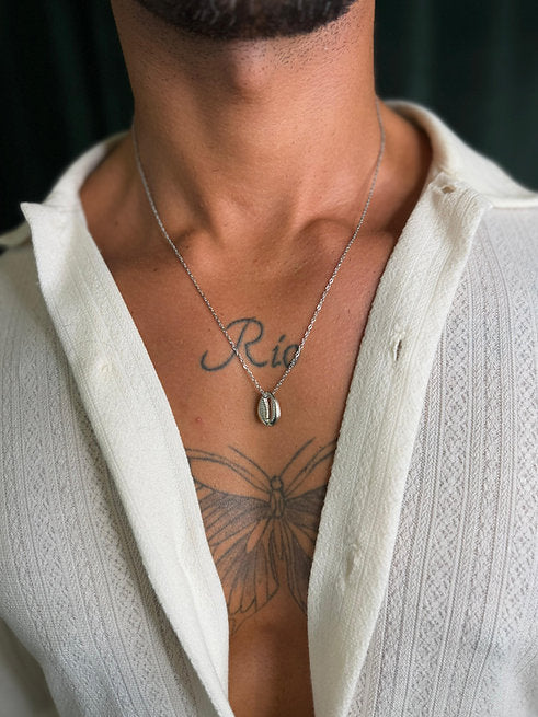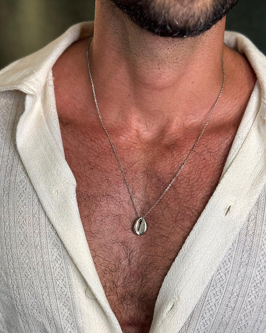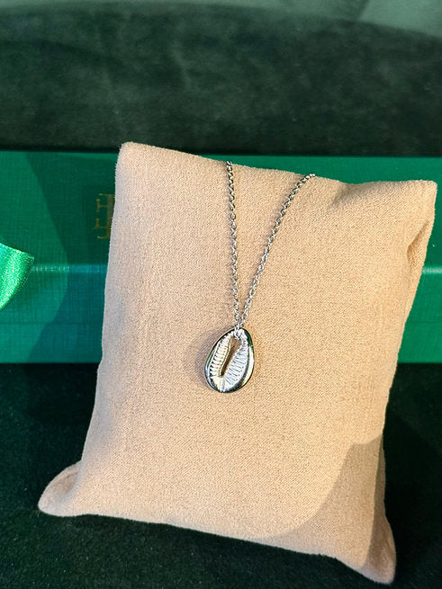 Colar com pingente de búzio banhado em ródio e corrente de 60cm em aço inoxidável que não muda de cor.