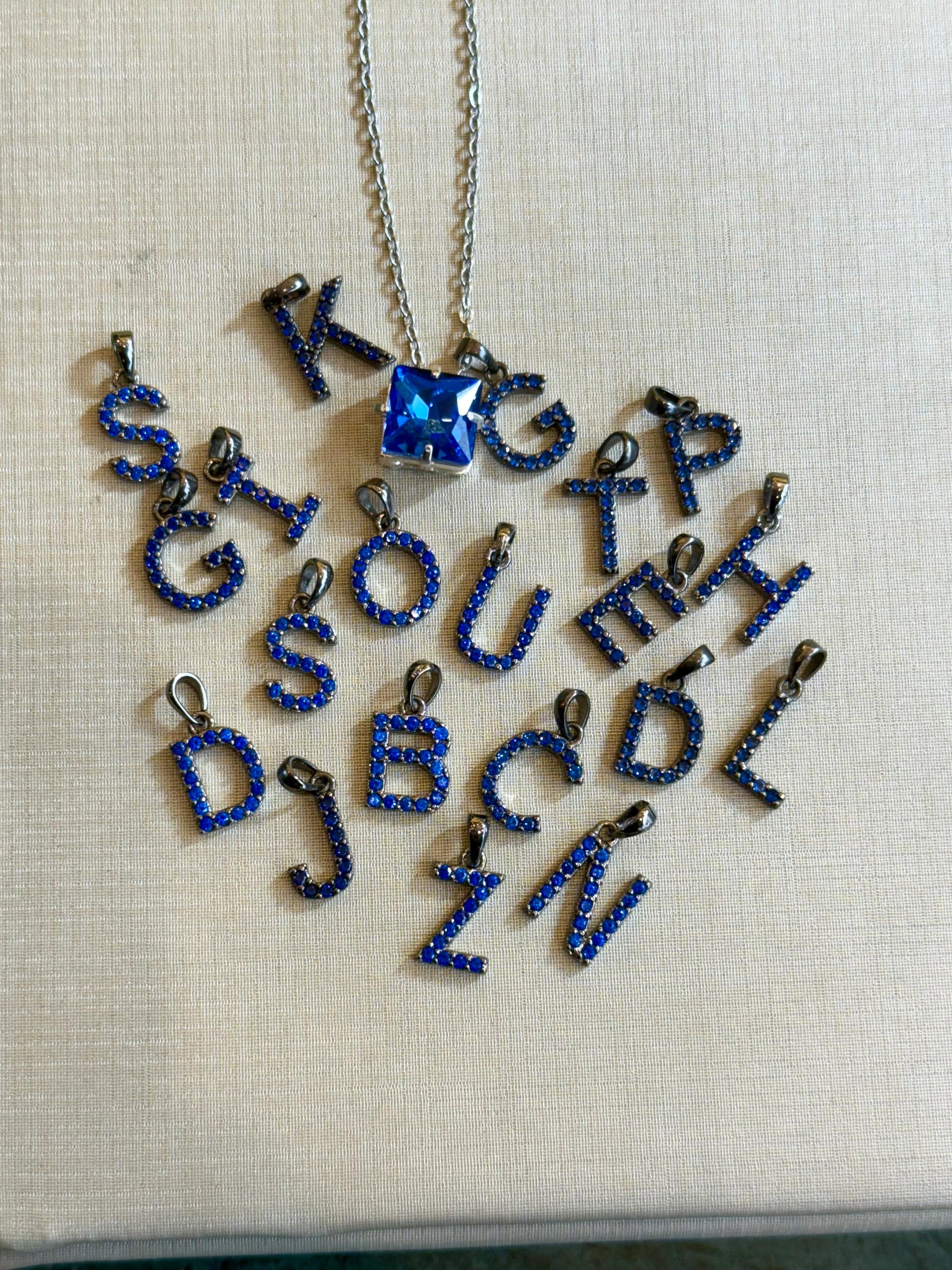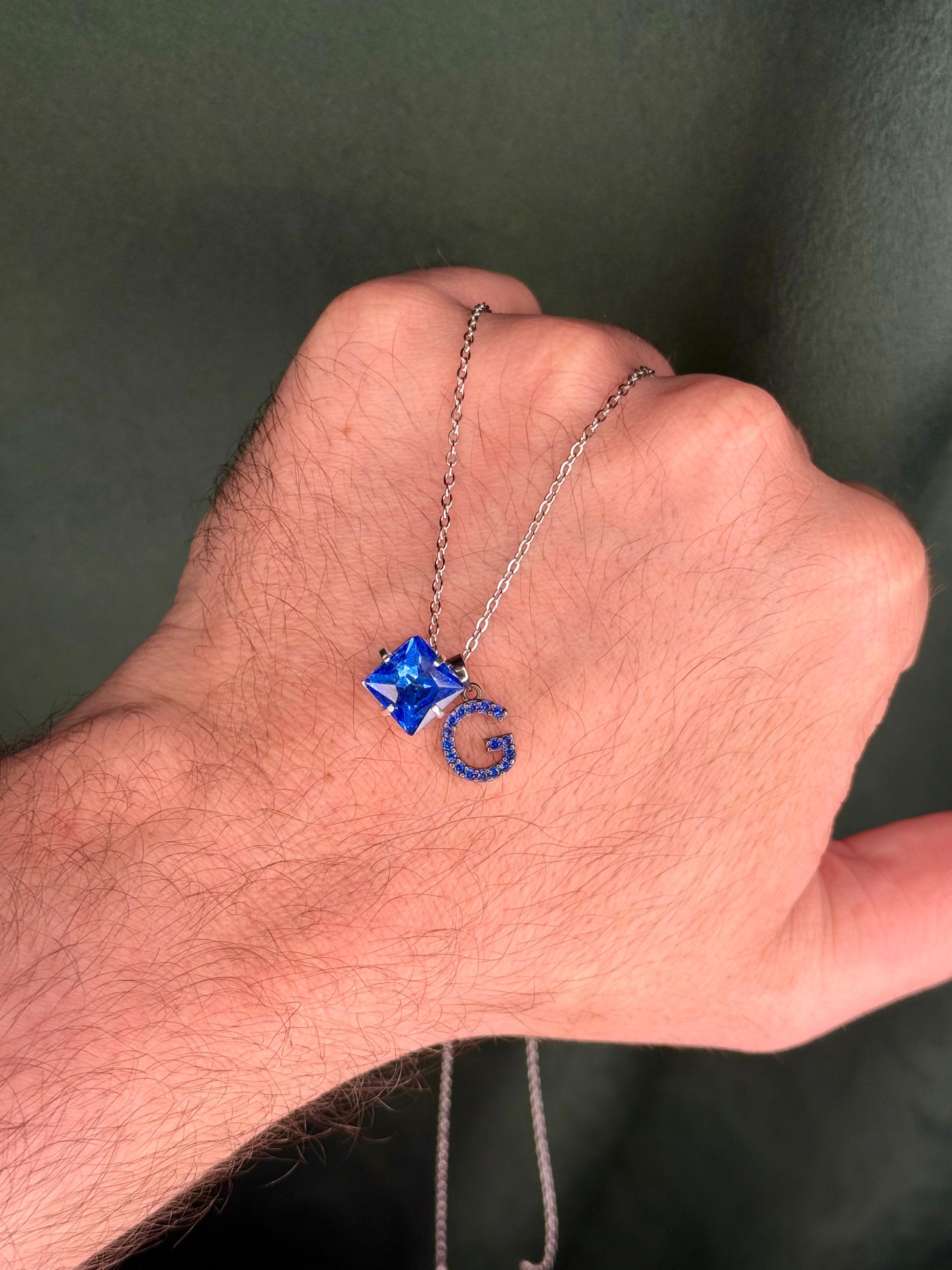 Colar em aço com pingente quadradinho e pingente inicial banhado em ródio negro (preto) e cravejados com zircônias de primeira linha na cor azul safira.