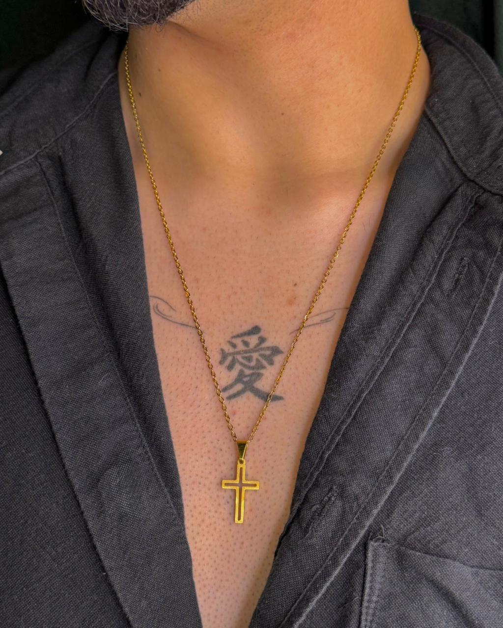 Colar em aço inoxidável com pingente e formato de cruz vazada, disponível também em banho de ouro 18k (dourado).