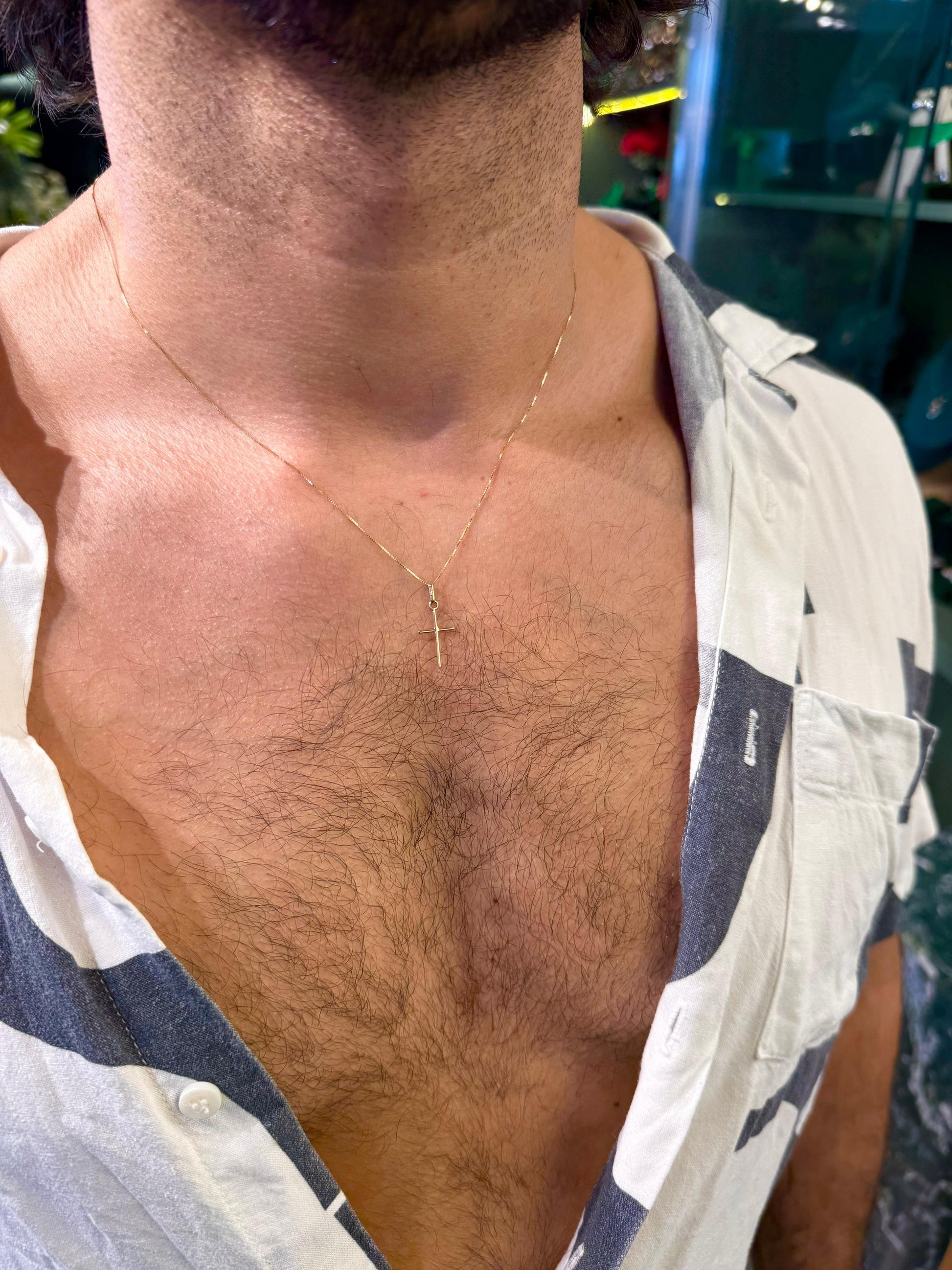 Colar em Ouro 18K, elegante e atemporal, pingente em formato cruz slim, pra um visual moderno. Uma peça sofisticada e versátil, perfeita para homens que valorizam estilo, exclusividade e o brilho eterno do ouro verdadeiro.