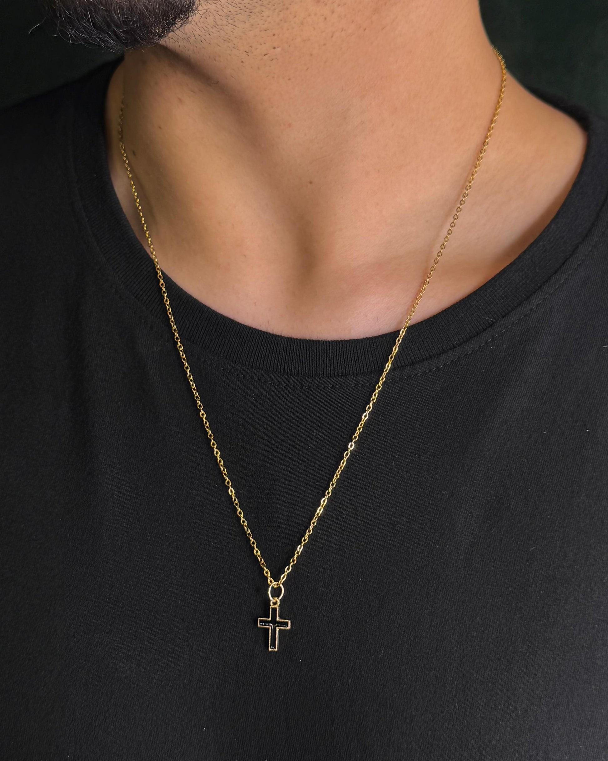 Colar com pingente de cruz resinado e banhado em ouro 18k e corrente de em aço inoxidável que não muda de cor, também banhada em ouro 18k.