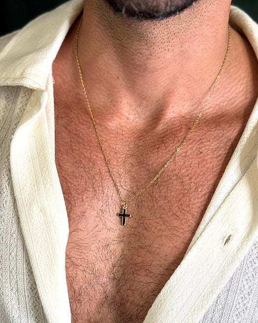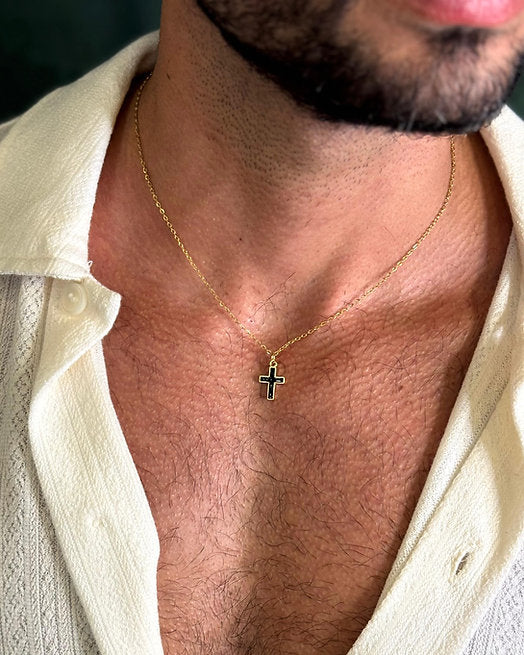 Colar com pingente de cruz resinado e banhado em ouro 18k e corrente de em aço inoxidável que não muda de cor, também banhada em ouro 18k.