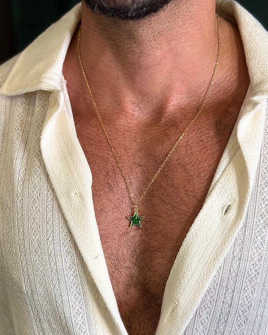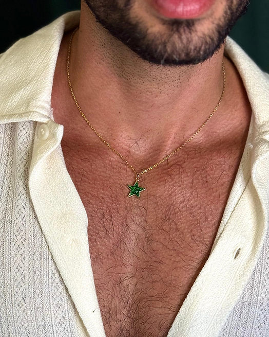 Colar de Estrela resinada na cor Verde, com corrente em aço inoxidável que não muda de cor, e banhada em ouro18k.