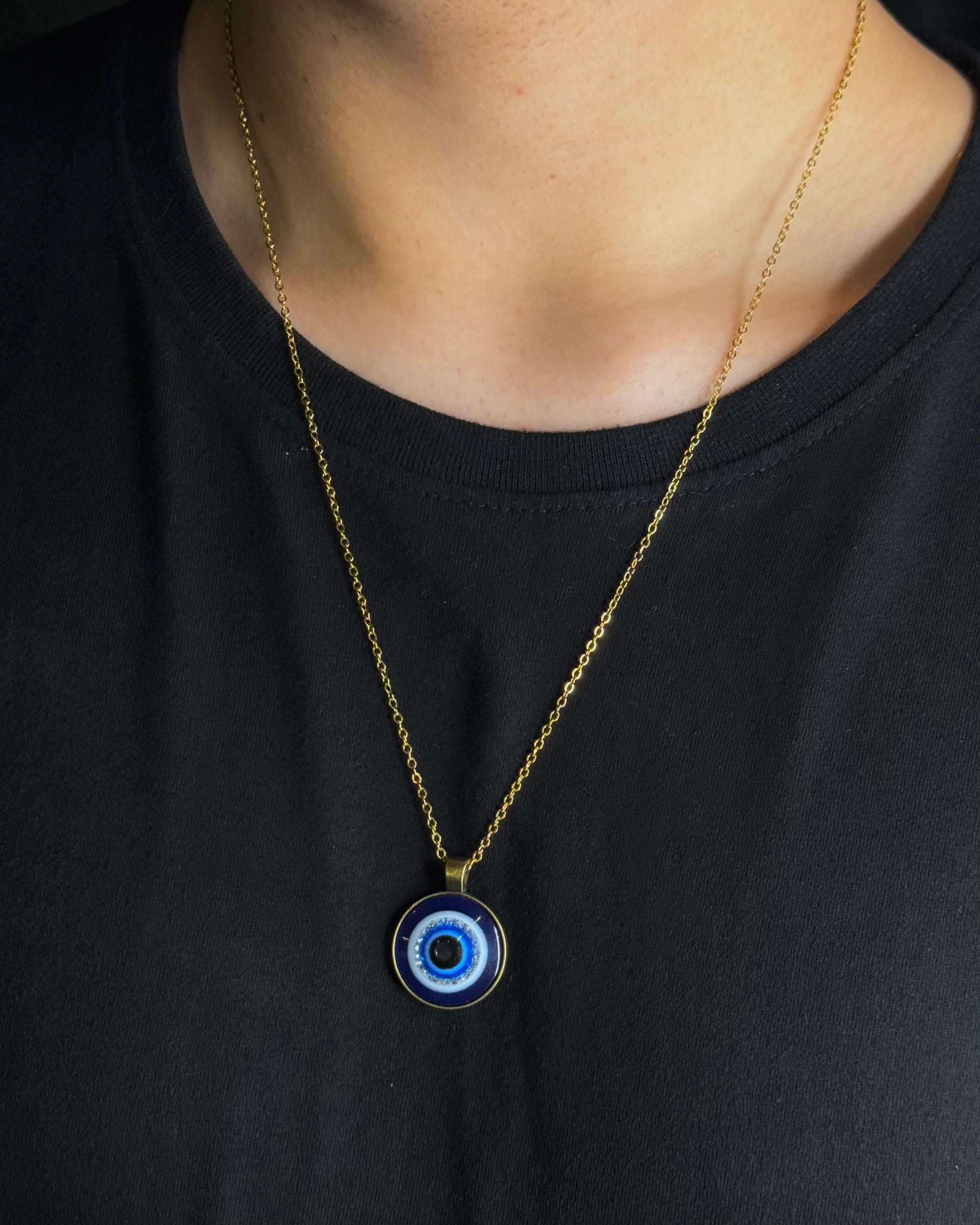 Colar com pingente resinado em formato de olho grego, com corrente em aço inoxidável banhada em ouro18k.