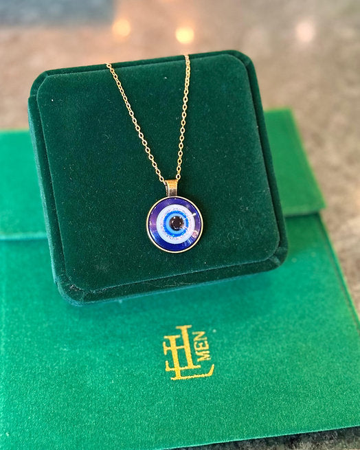 Colar com pingente resinado em formato de olho grego, com corrente em aço inoxidável banhada em ouro18k.