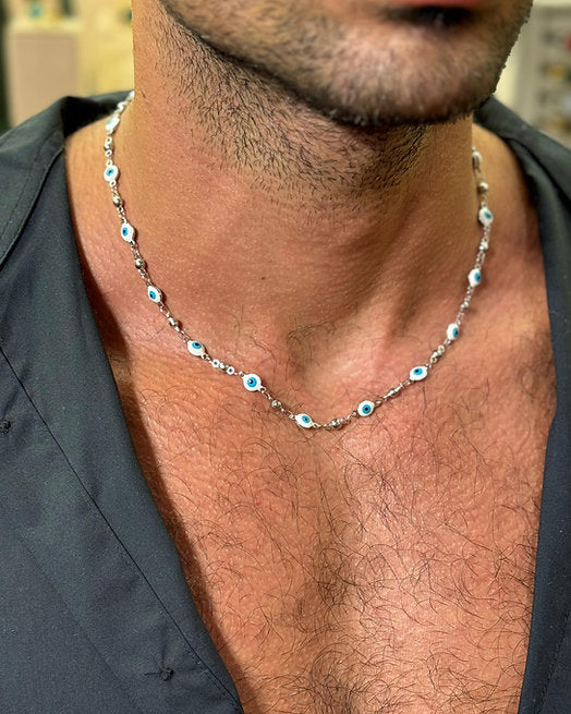 Colar com pingentes de olhos gregos resinados, feito em aço inoxidável que não muda de cor, tem cerca de 45cm + 5cm de extensor. Também disponível no banho de ouro18k.