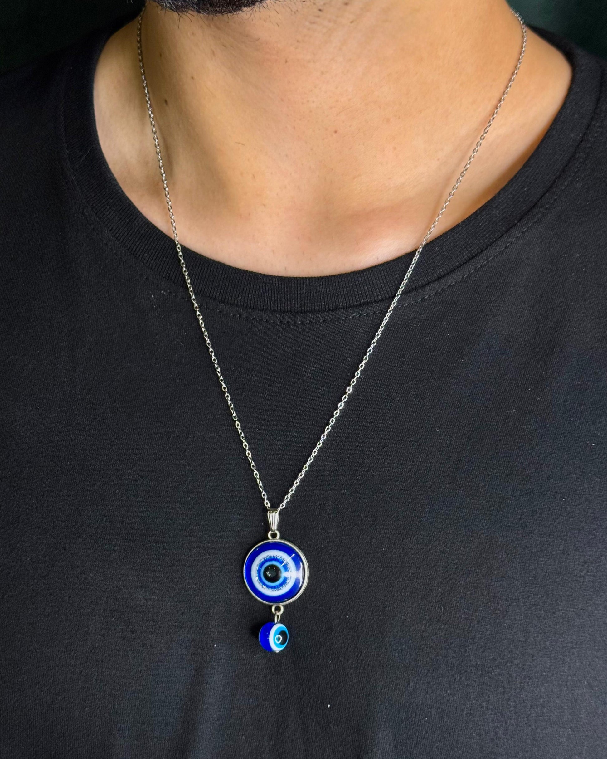 Colar com pingente resinado em formato de olho grego, com corrente em aço inoxidável.