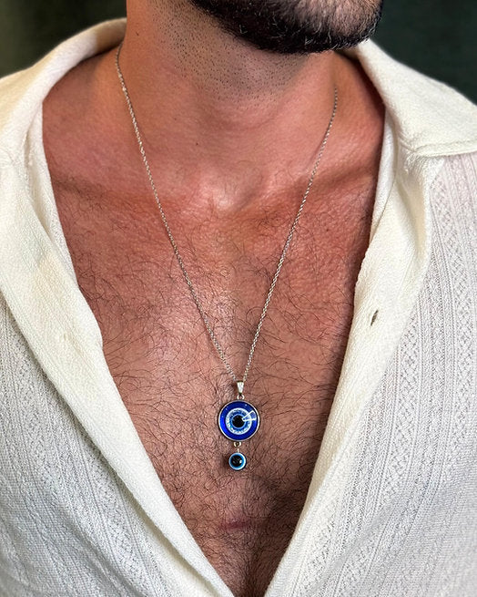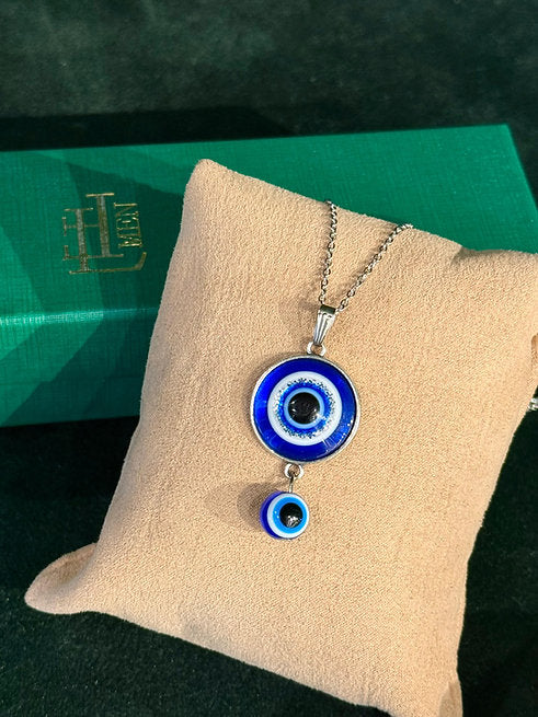 Colar com pingente resinado em formato de olho grego, com corrente em aço inoxidável.