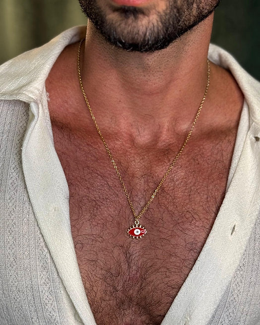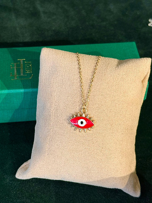 Colar de olho grego estilizado na cor vermelha, com corrente em aço inoxidável que não muda de cor, disponível também na cor dourada (banho de ouro 18k)