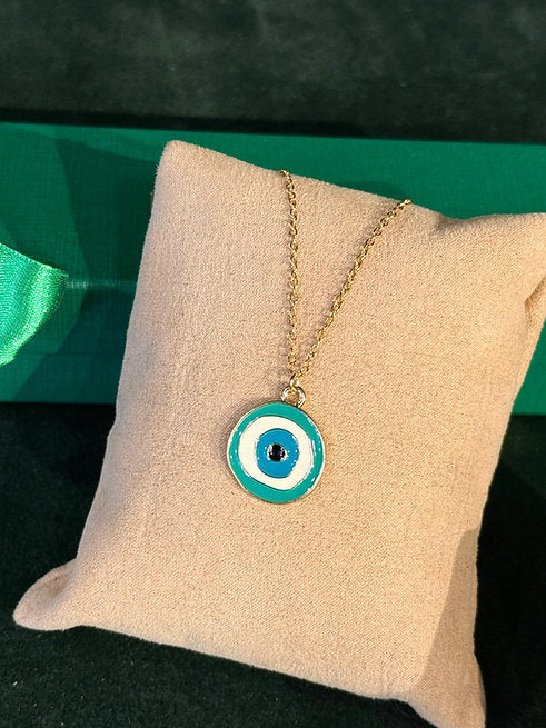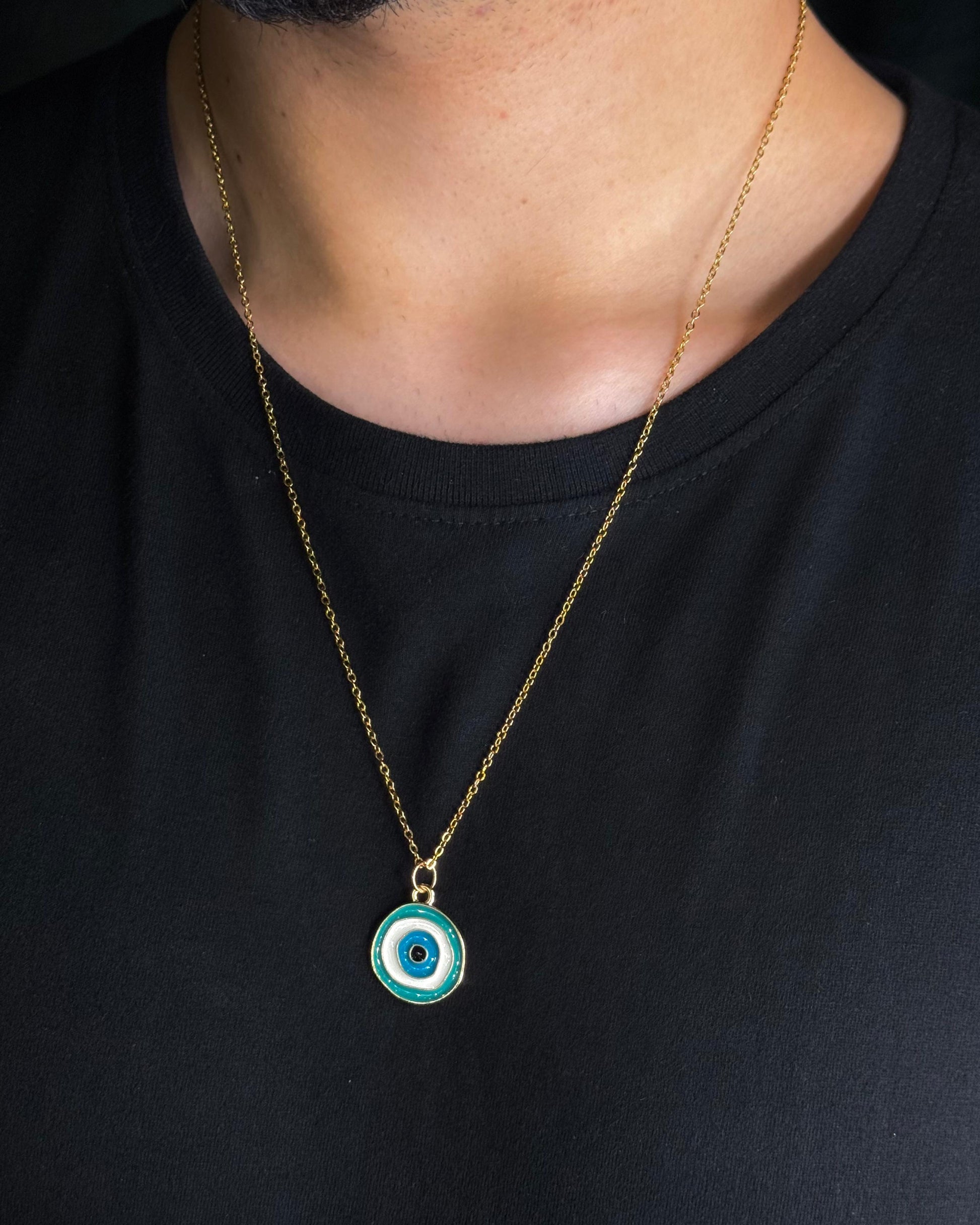 Colar com pingente resinado em formato de olho grego, com corrente em aço inoxidável banhada em ouro18k.