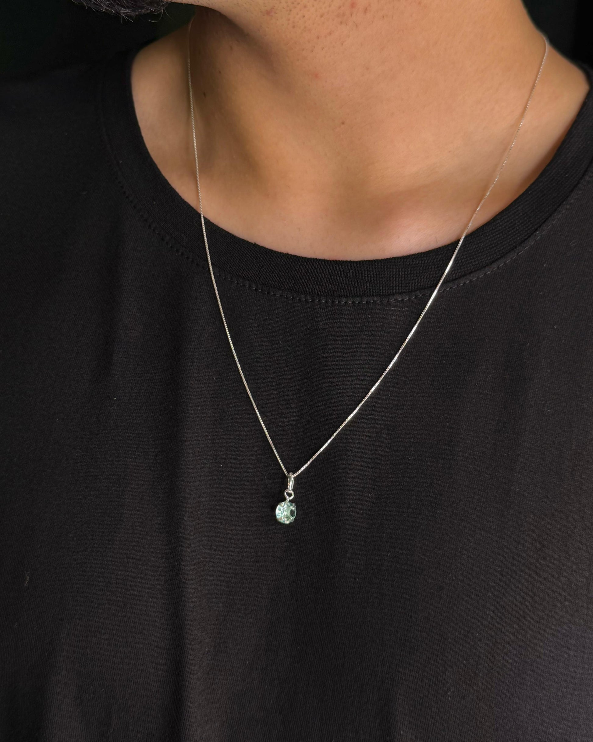 Colar em veneziana com delicado pingente ponto de luz, cravejado com zircônia de primeira linha na cor Eden (verde claro), disponível em três tamanhos, 50cm, 60cm e 70cm.