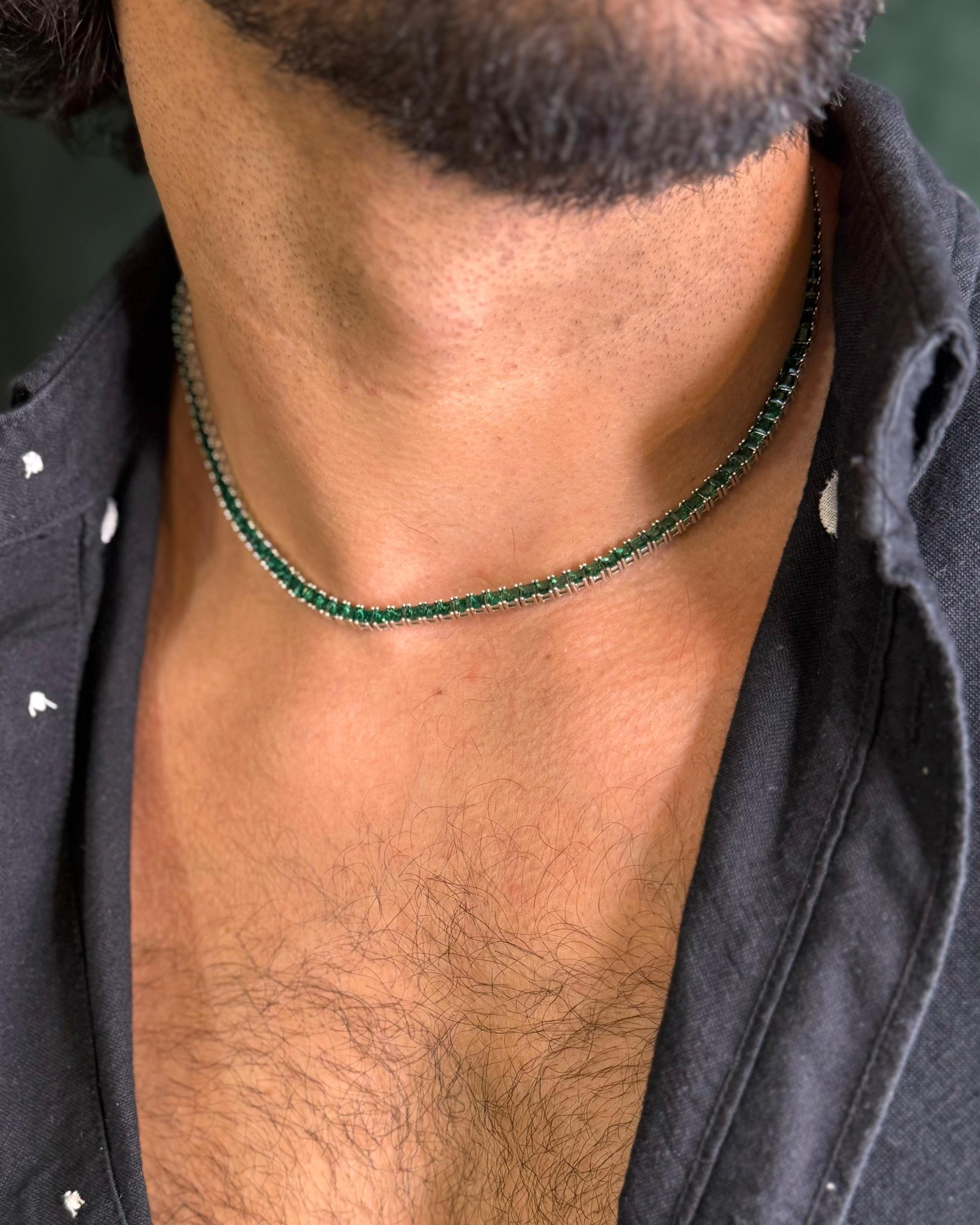 Colar banhado em ródio e cravejado com zircônias de primeira linha na cor esmeralda.