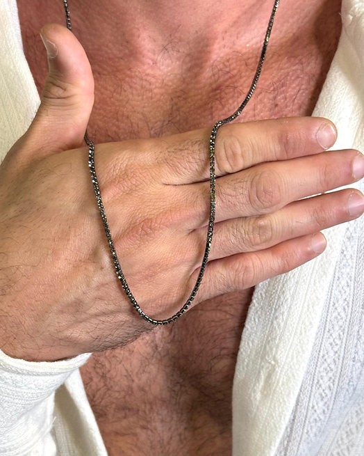 Do casual ao chique, o colar riviera é versátil pra elevar seu look em qualquer situação. Banhado em ródio negro, e todo cravejado com zircônias de primeira linha na cor preto black diamond. Com aproximadamente 70cm.