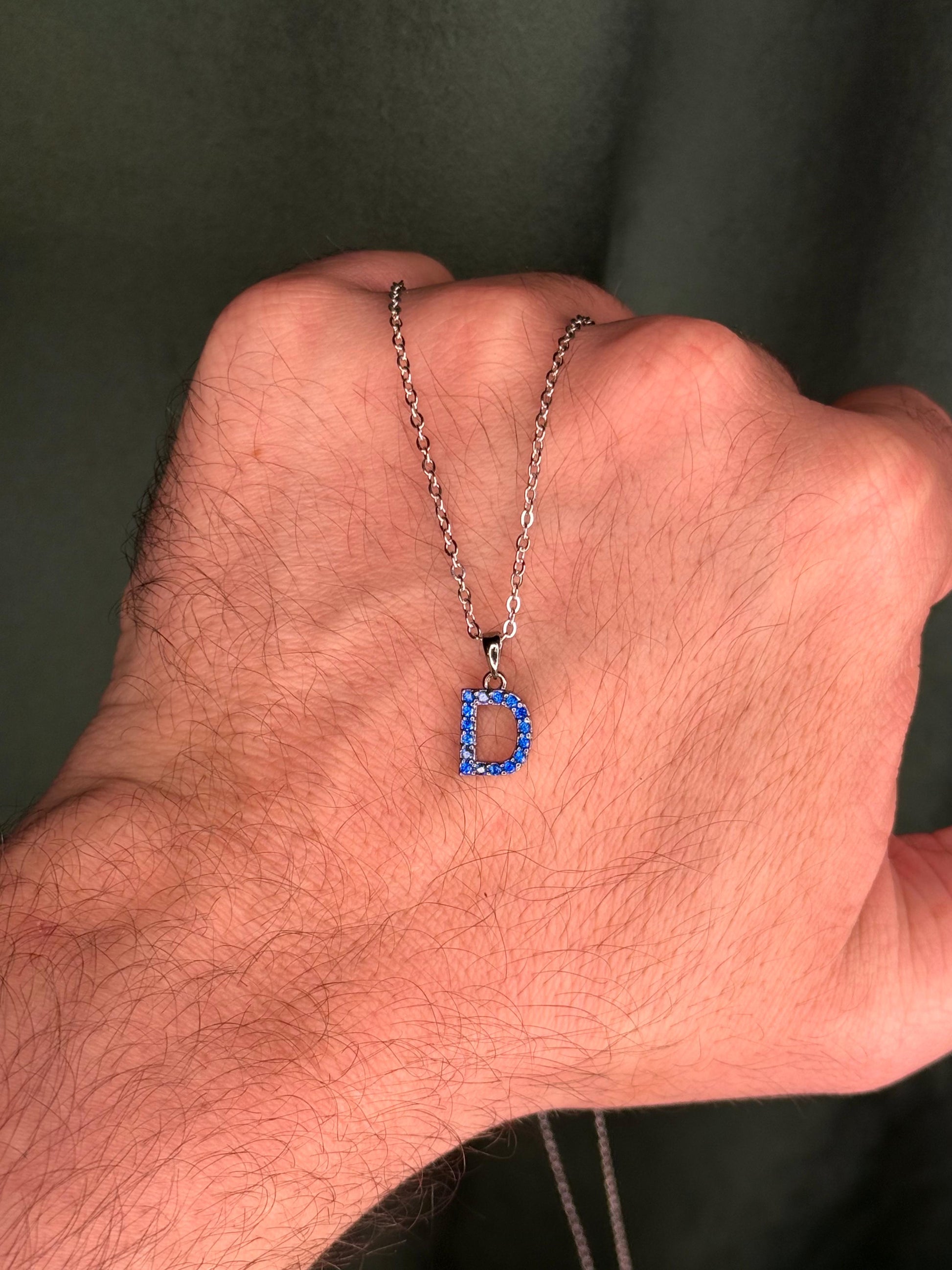 Colar em aço com pingente banhado em ródio negro (preto) e cravejados com zircônias de primeira linha na cor azul safira.
