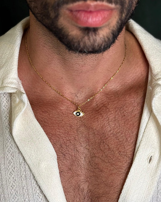 Colar com pingente de olho resinado e banhado em ouro 18k e corrente de em aço inoxidável que não muda de cor, também banhada em ouro 18k.