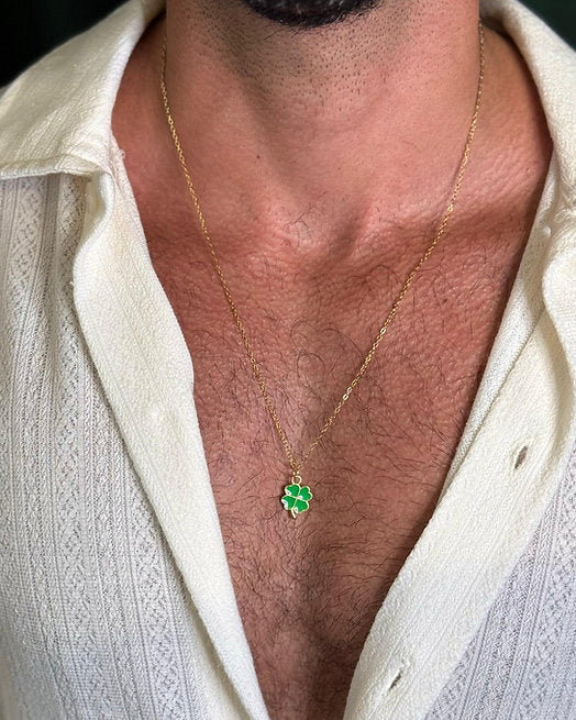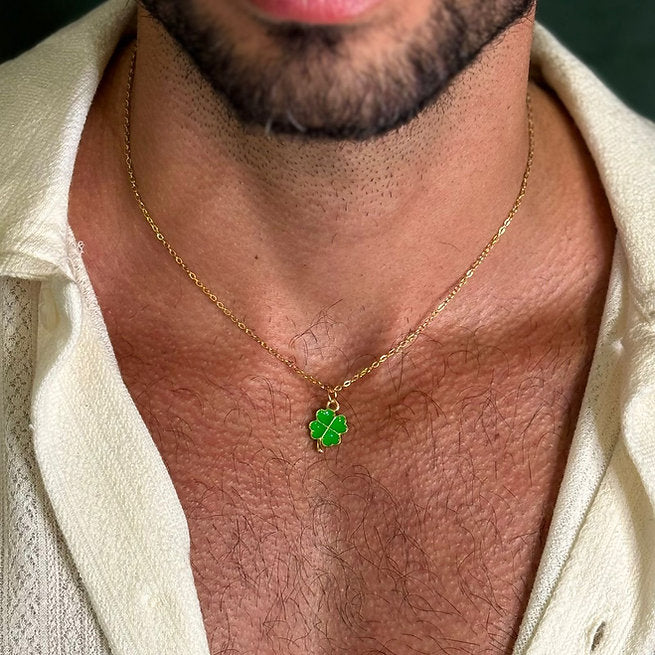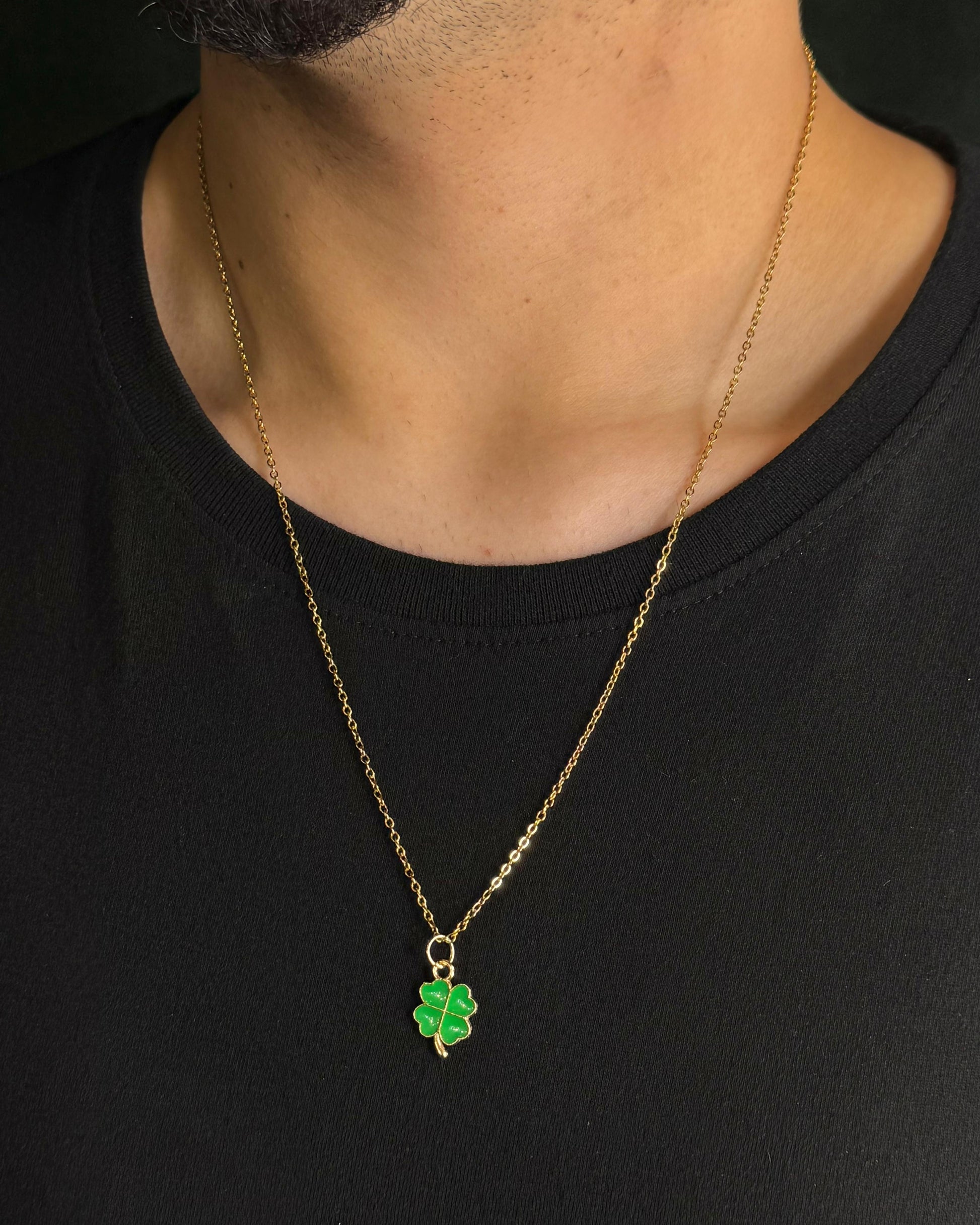 Colar com pingente resinado de trevo de 4 folhas para trazer sorte, em corrente em aço inoxidável banhada em ouro18k.