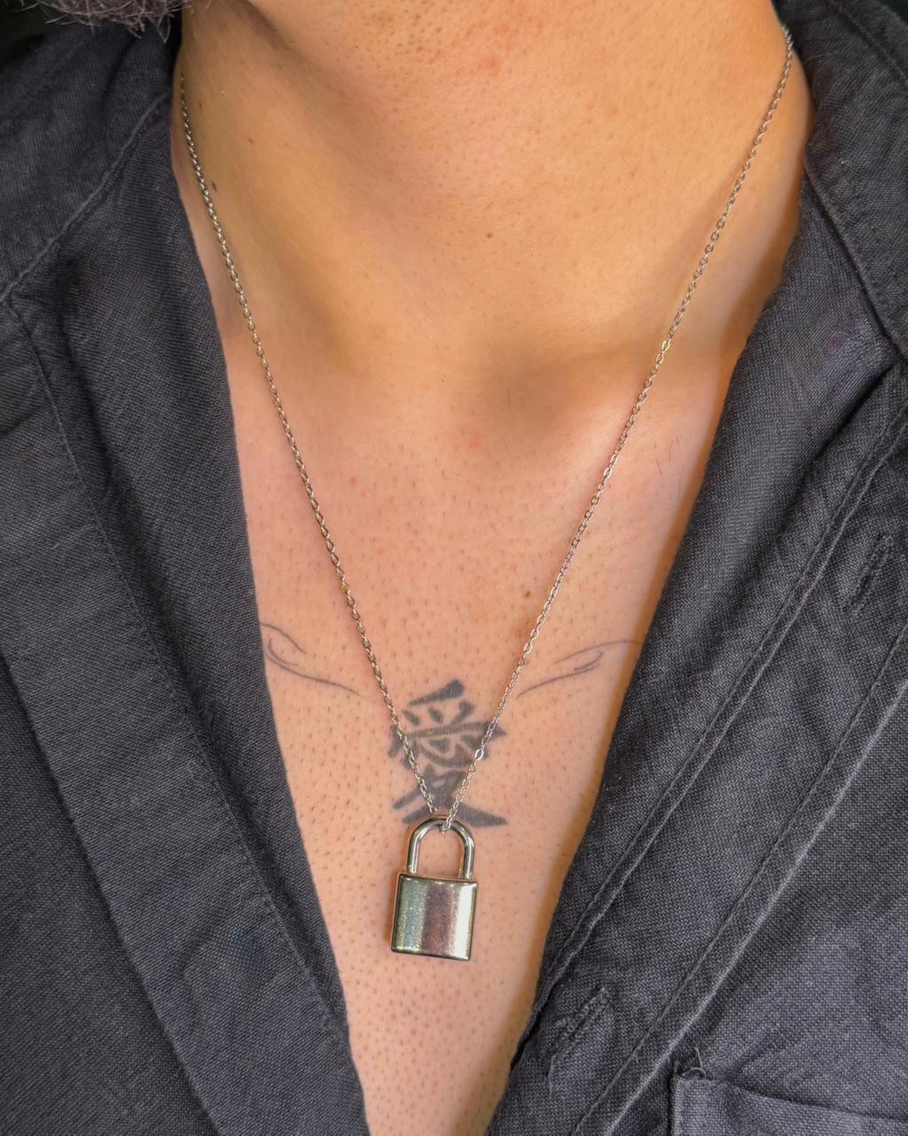 Colar em aço inoxidável com pingente em formato de cadeado.