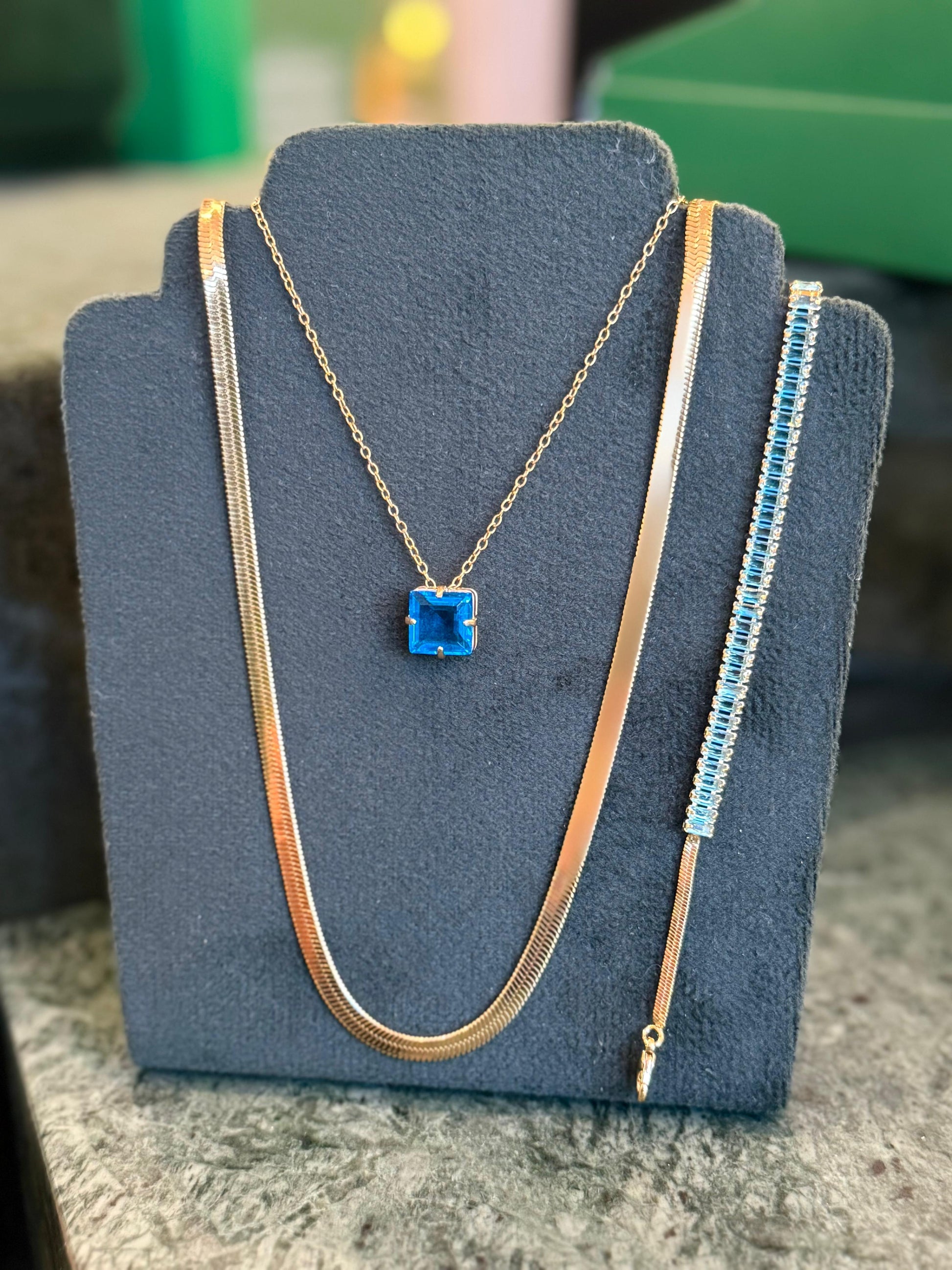 Kit promocional composto por 3 peças, sendo dois colares em aço inoxidável e uma pulseira em semijoia banhada em ouro 18k (dourado) cavejada com zircônias de primeira linha.