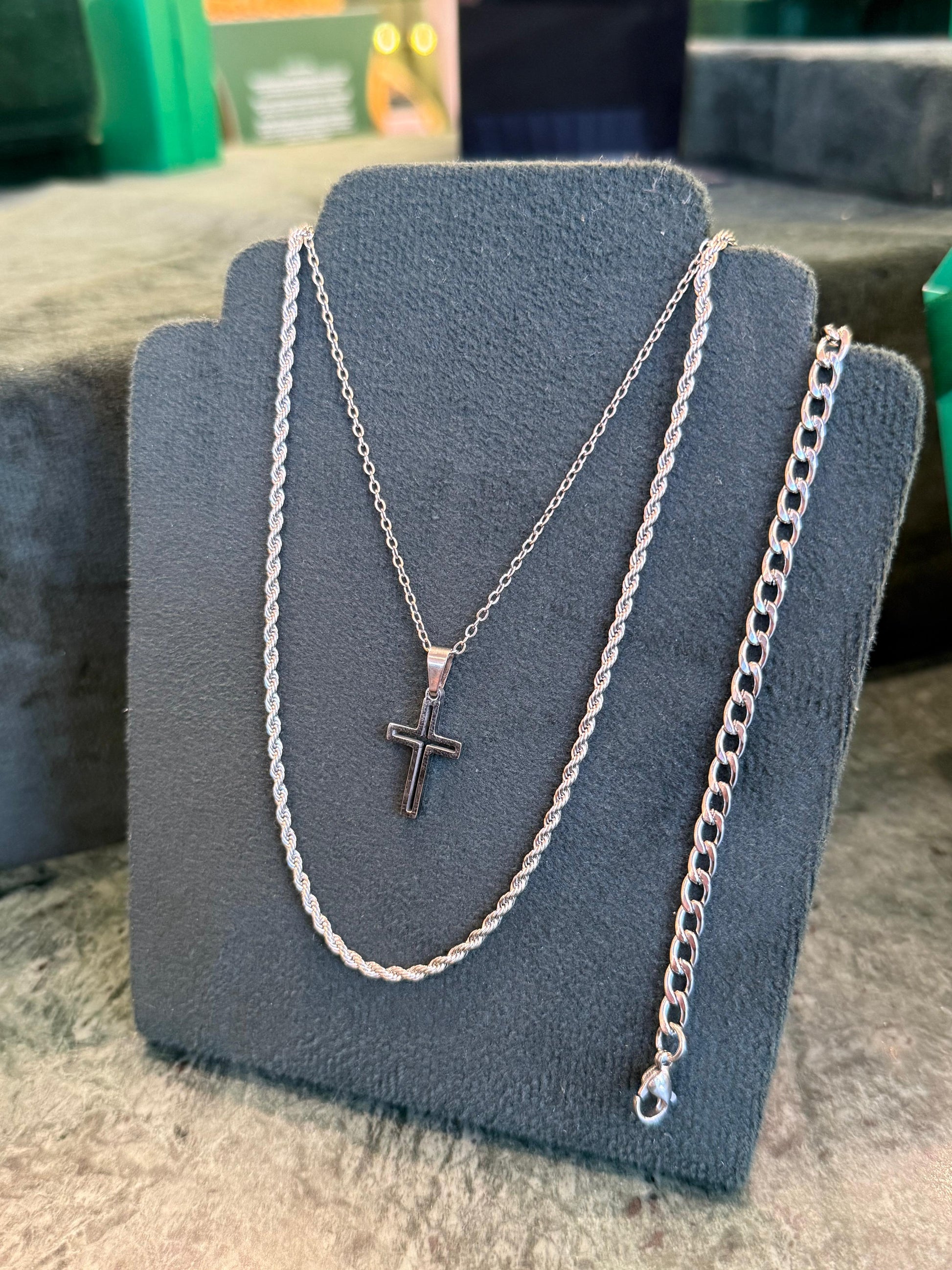 Kit promocional composto por 3 peças em aço inoxidável, sendo dois colares e uma pulseira.