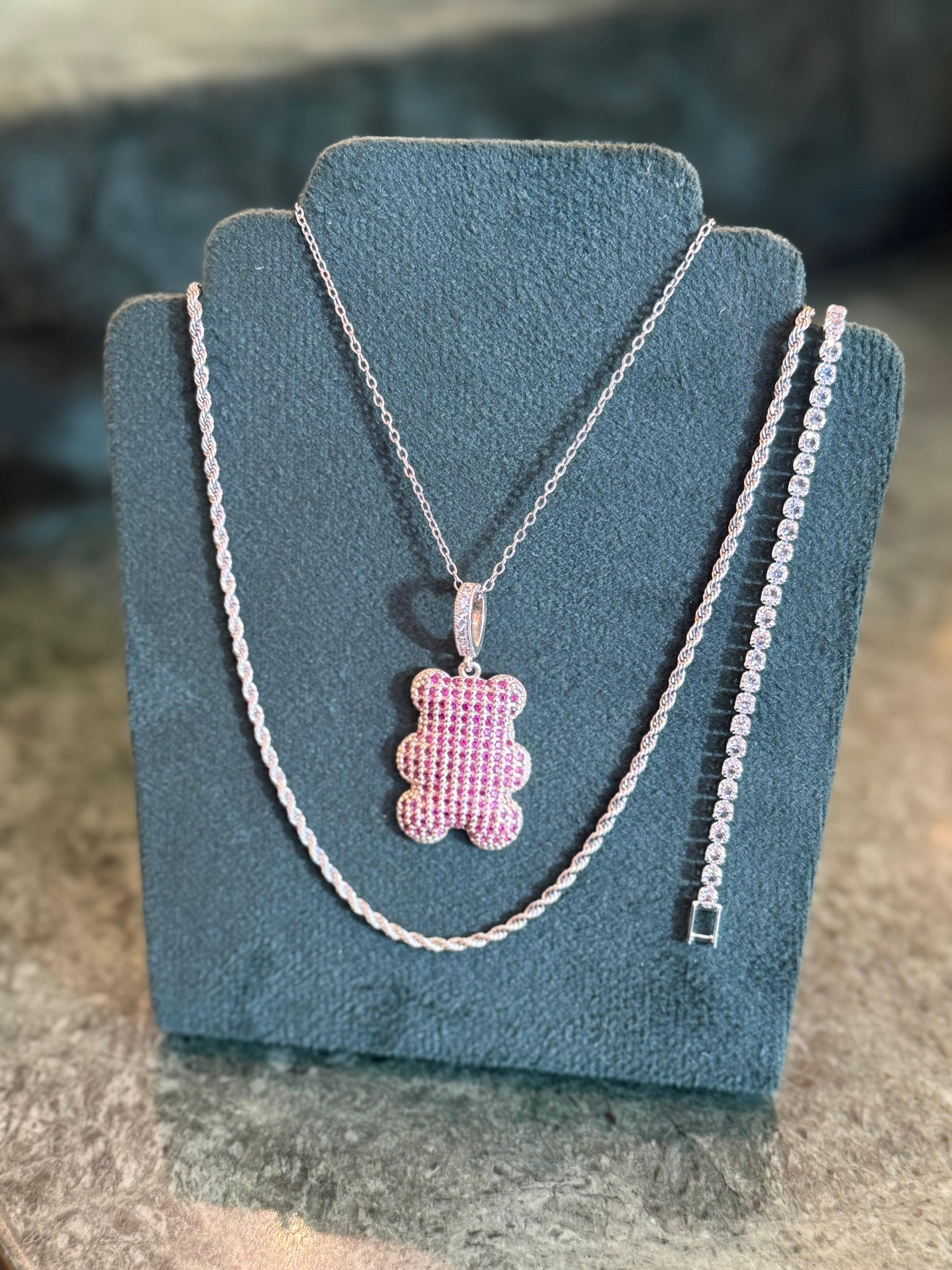 Kit promocional composto por 2 colares e 1 pulseira em aço inoxidável, cravejado com zircônias, sendo o pingente de urso em semijoia banhado em ródio (prateado).