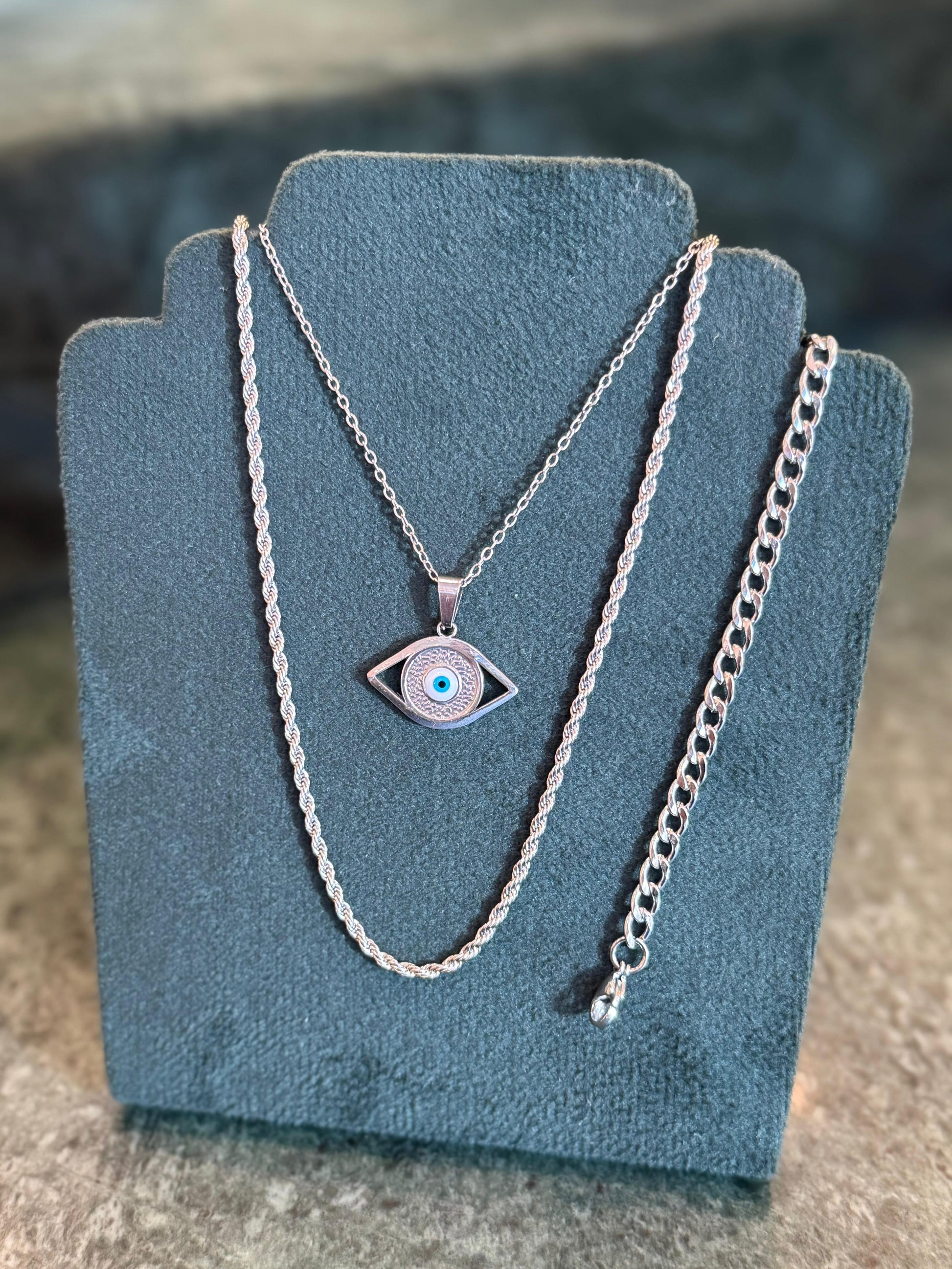 Kit promocional composto por 2 colares e 1 pulseira em aço inoxidável sendo o pingente uma estilização do olho grego.
