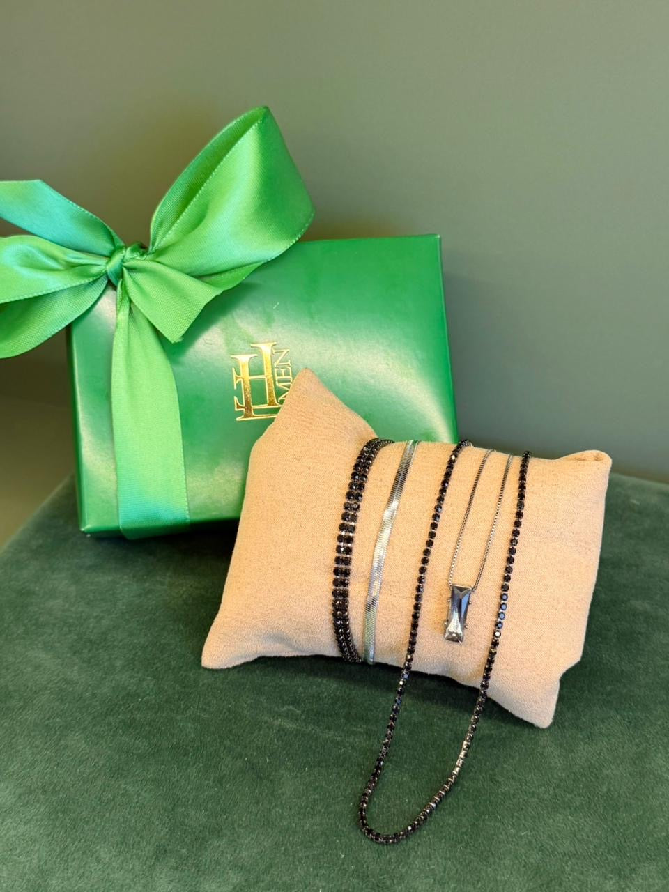 Kit especial composto por 4 peças, sendo essas 2 colares e 2 pulseiras. As peças variam entre aço e semijoia banhadas em ródio (prateado), cravejados com zircônias de primeira linha.