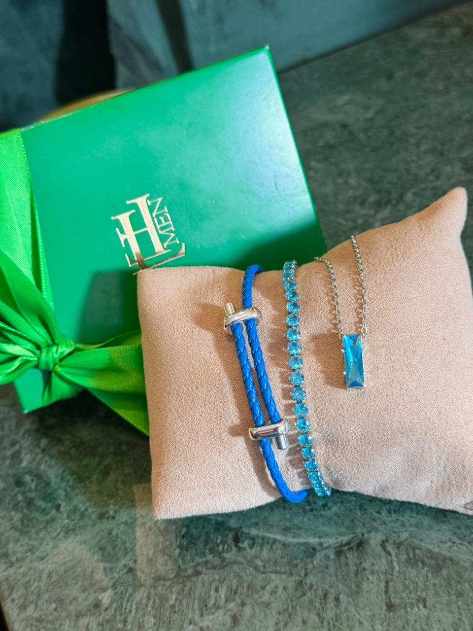 Kit especial com 3 peças sendo 1 colar Empire 60cm de corrente e 2 pulseiras. Peças em aço e cravejadas com zircônias de primeira linha.