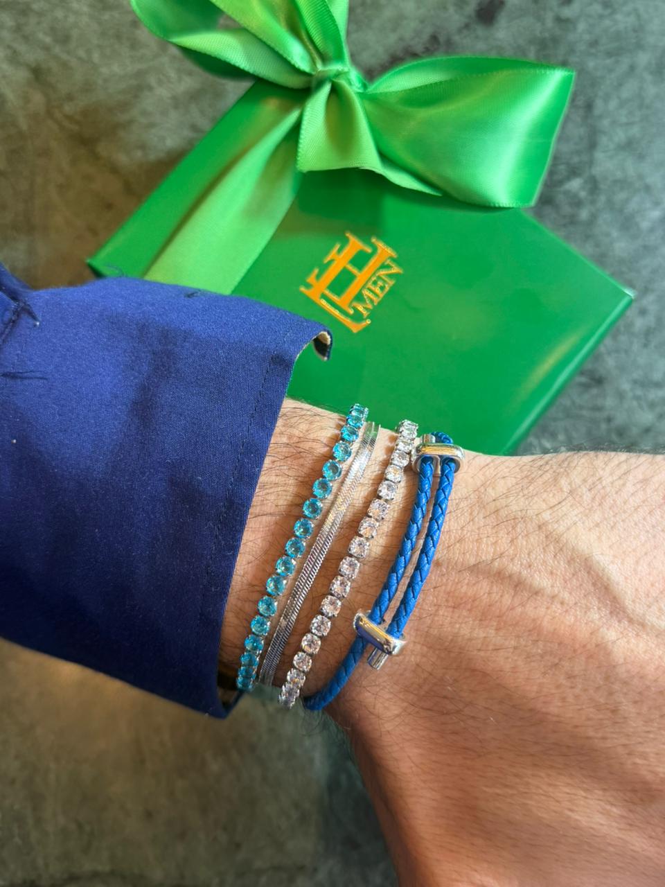 Kit especial com 4 peças em aço e cravejadas com zircônias. Incluindo duas rivieras clássicas LFmen, uma pulseira Star e uma pulseira skin, permitindo várias combinações.