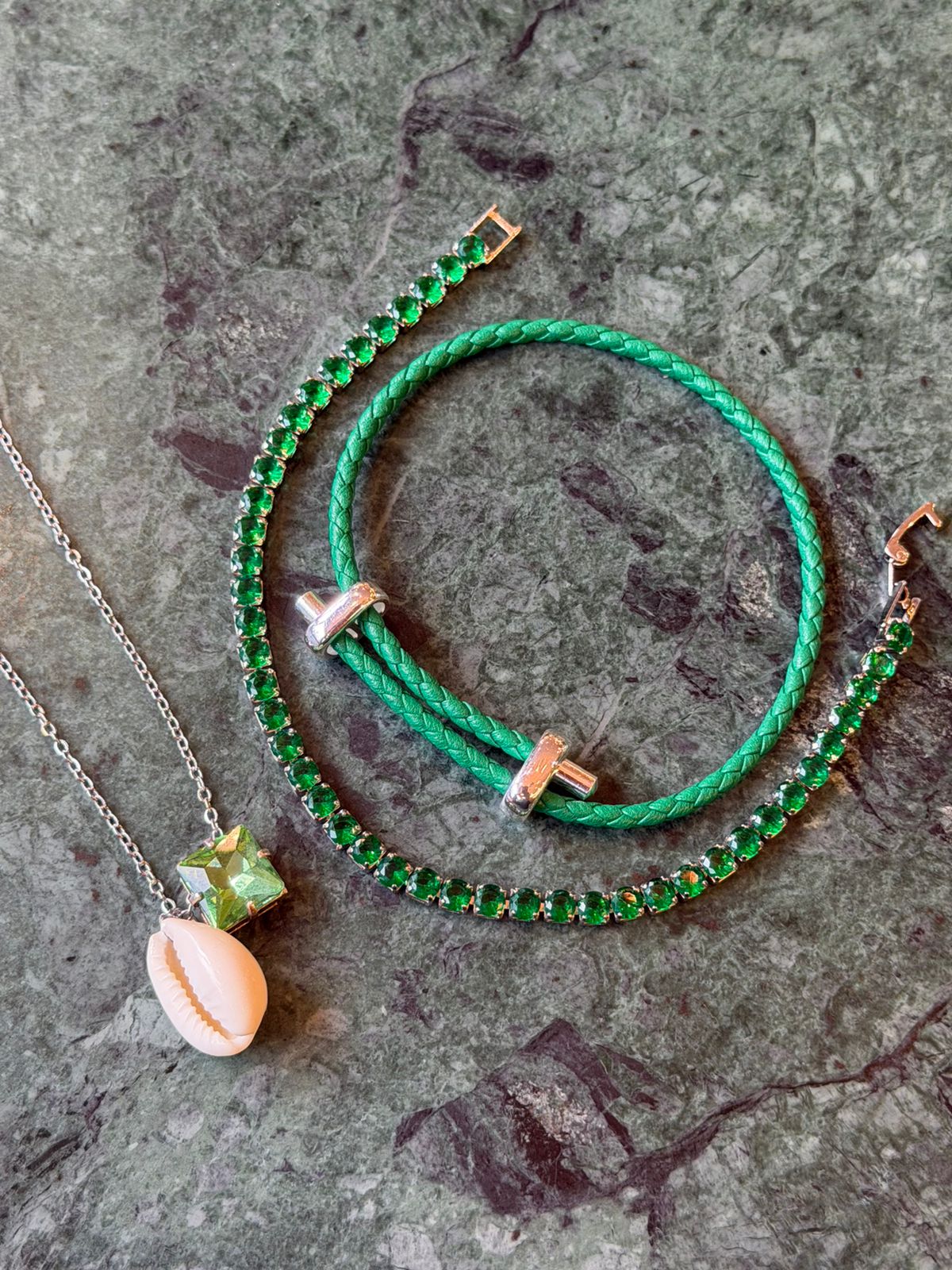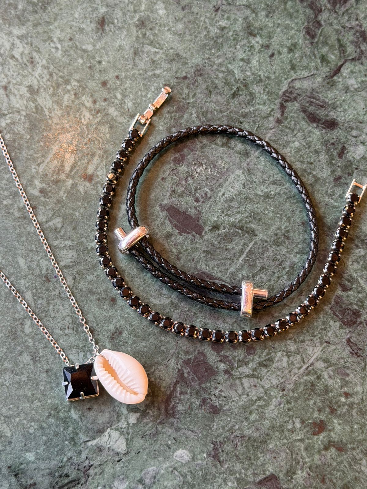Peças em aço e cravejadas com zircônias, pulseira star em courino sintético.