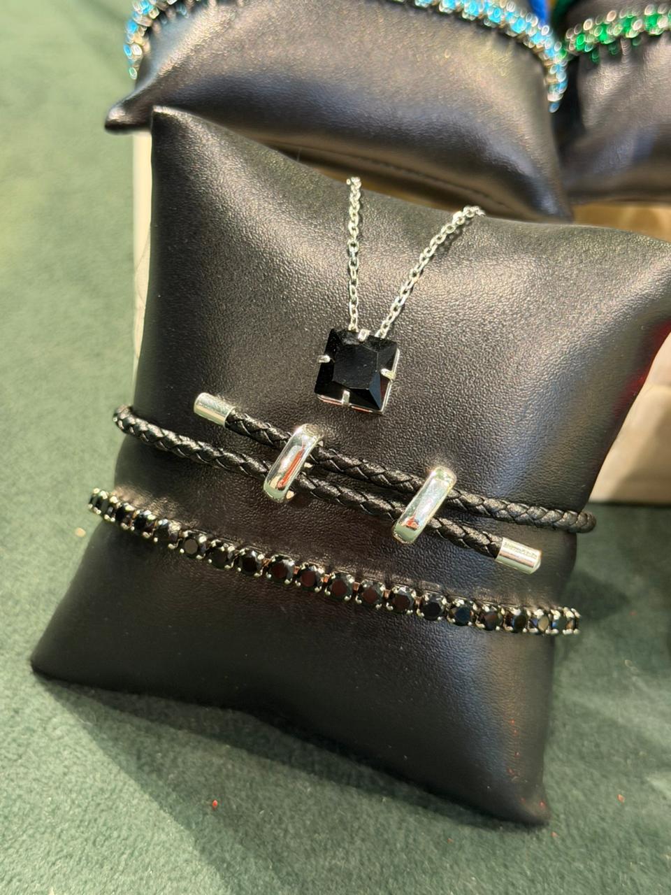 Peças em aço e cravejadas com zircônias, pulseira star em courino sintético.