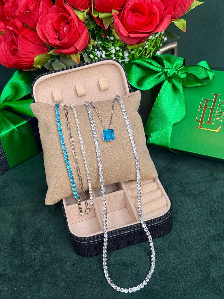 Kit especial composto por 5 peças, sendo essas 2 colares e 3 pulseiras. As peças variam entre aço e semijoia banhadas em ródio (prateado), cravejados com zircônias de primeira linha nas cores cristal e dubai.