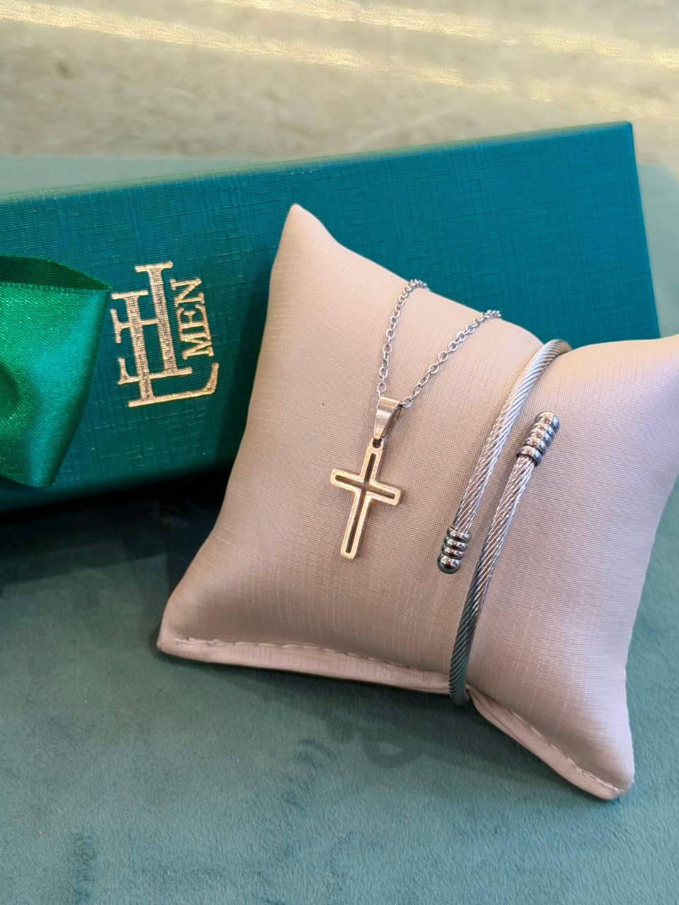 Kit especial moderno e discreto com colar de cruz + bracelete ajustável
