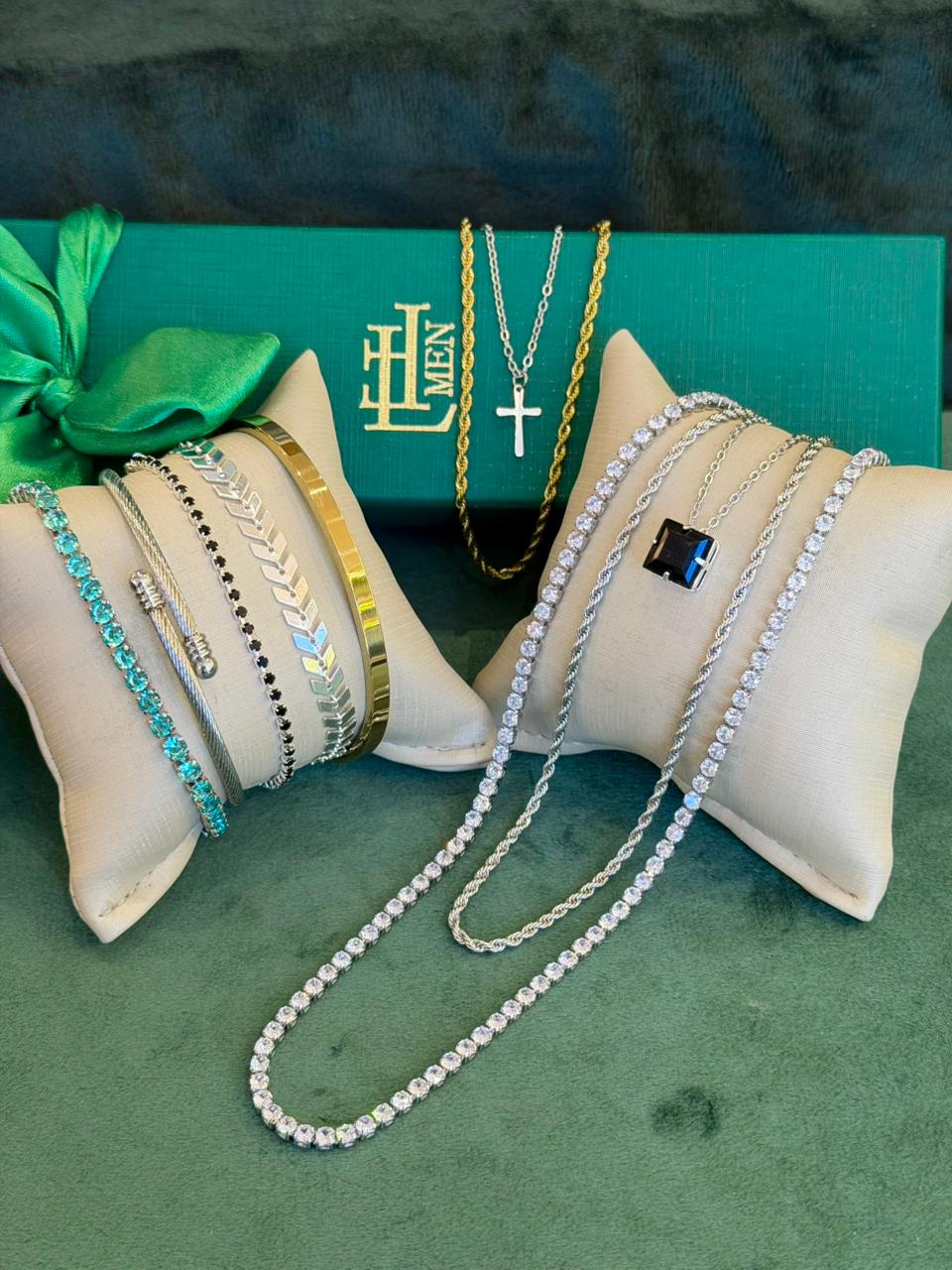 Este kit vai com 10 peças sendo 5 colares e 5 pulseiras. Com peças em aço e semijóias banhadas em ródio ou em ouro18k, e cravejadas com zircônias de primeira linha