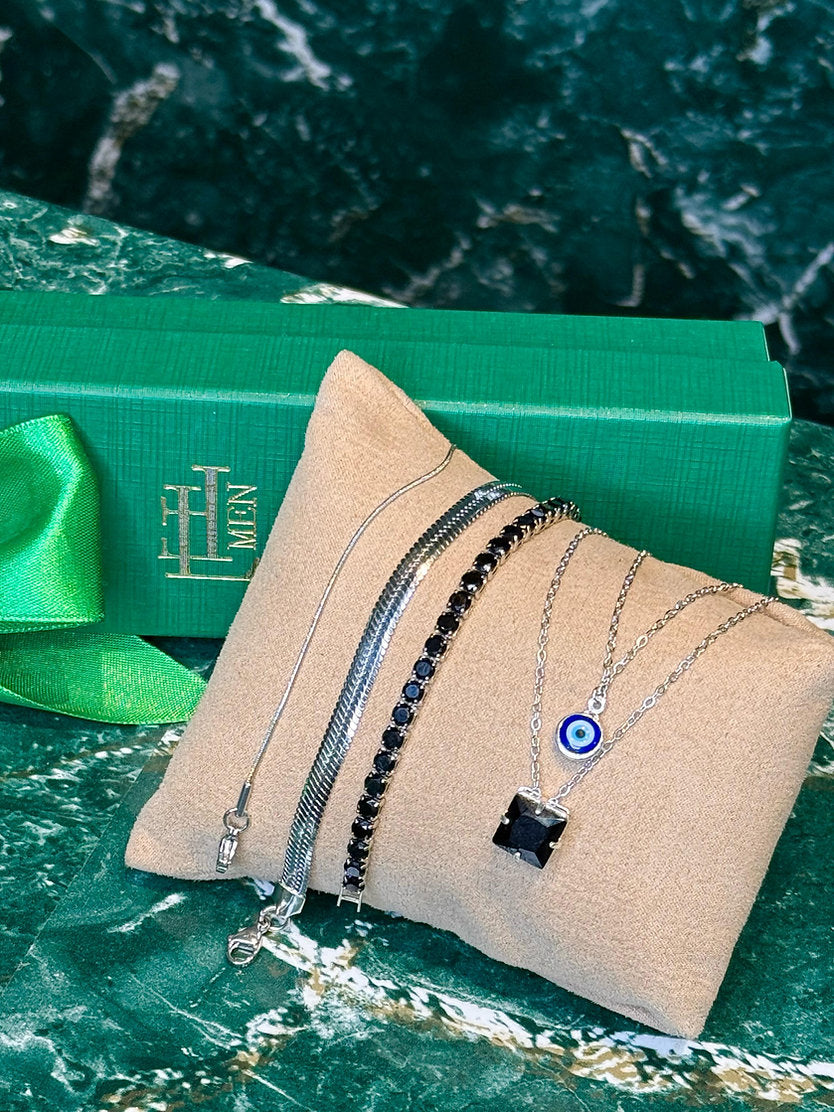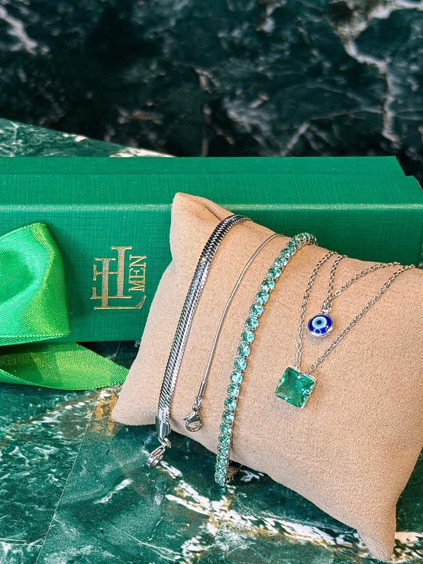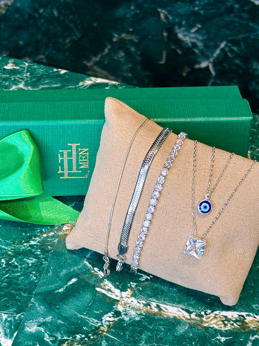 Kit promocional com 5 peças sendo 2 colares, 2 pulseiras lisas e 1 pulseira riviera. Peças em aço e semijoia banhadas em ródio (prateado) e cravejadas com zircônias de primeira linha.