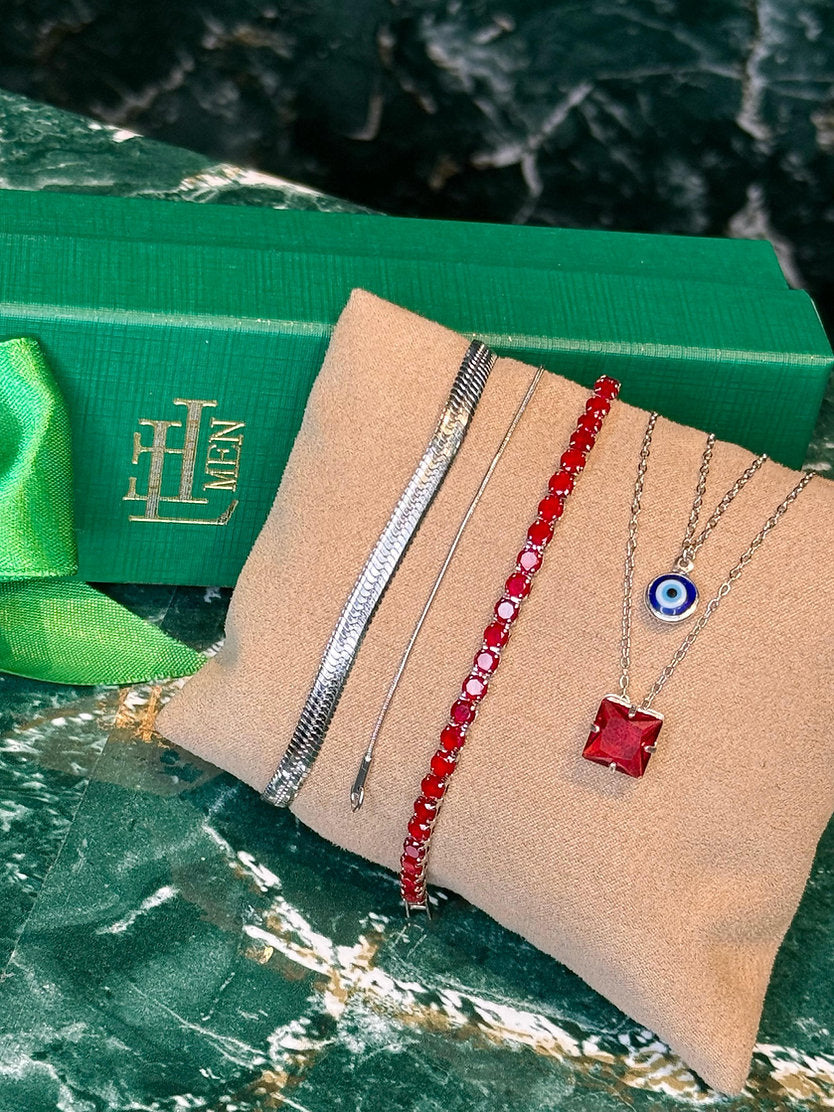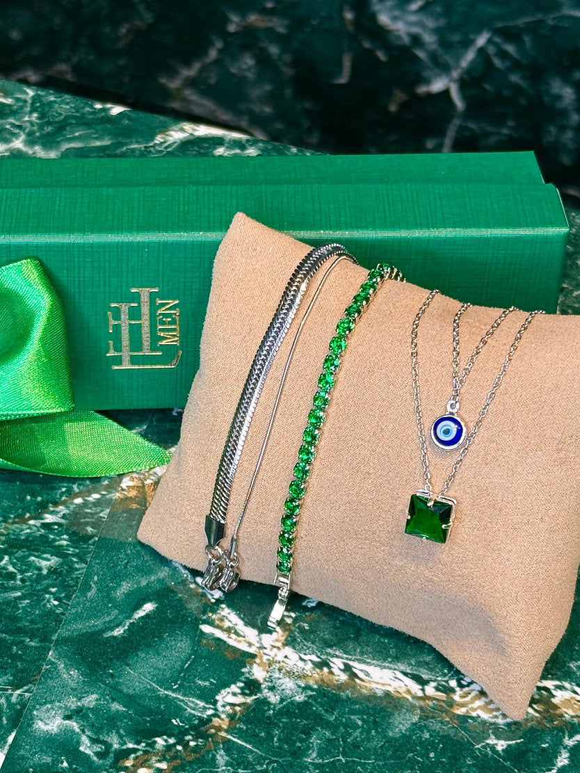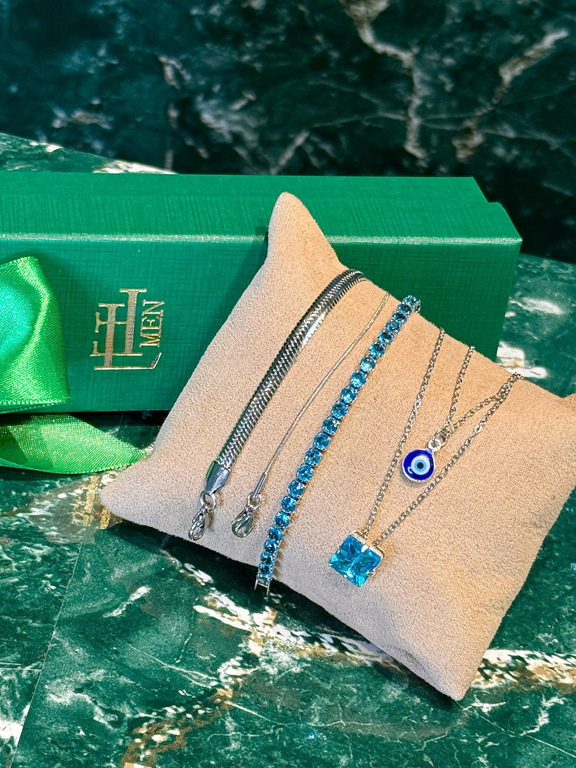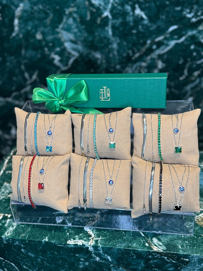 Kit promocional com 5 peças sendo 2 colares, 2 pulseiras lisas e 1 pulseira riviera. Peças em aço e semijoia banhadas em ródio (prateado) e cravejadas com zircônias de primeira linha.