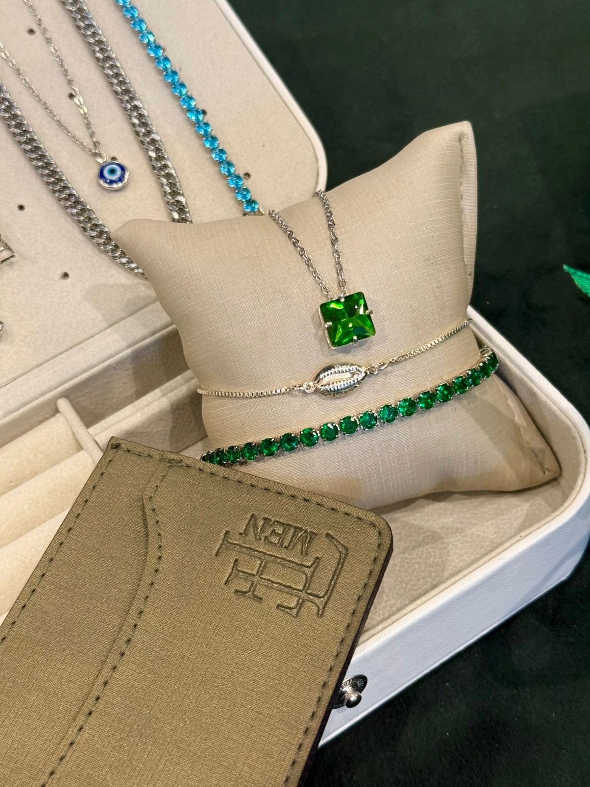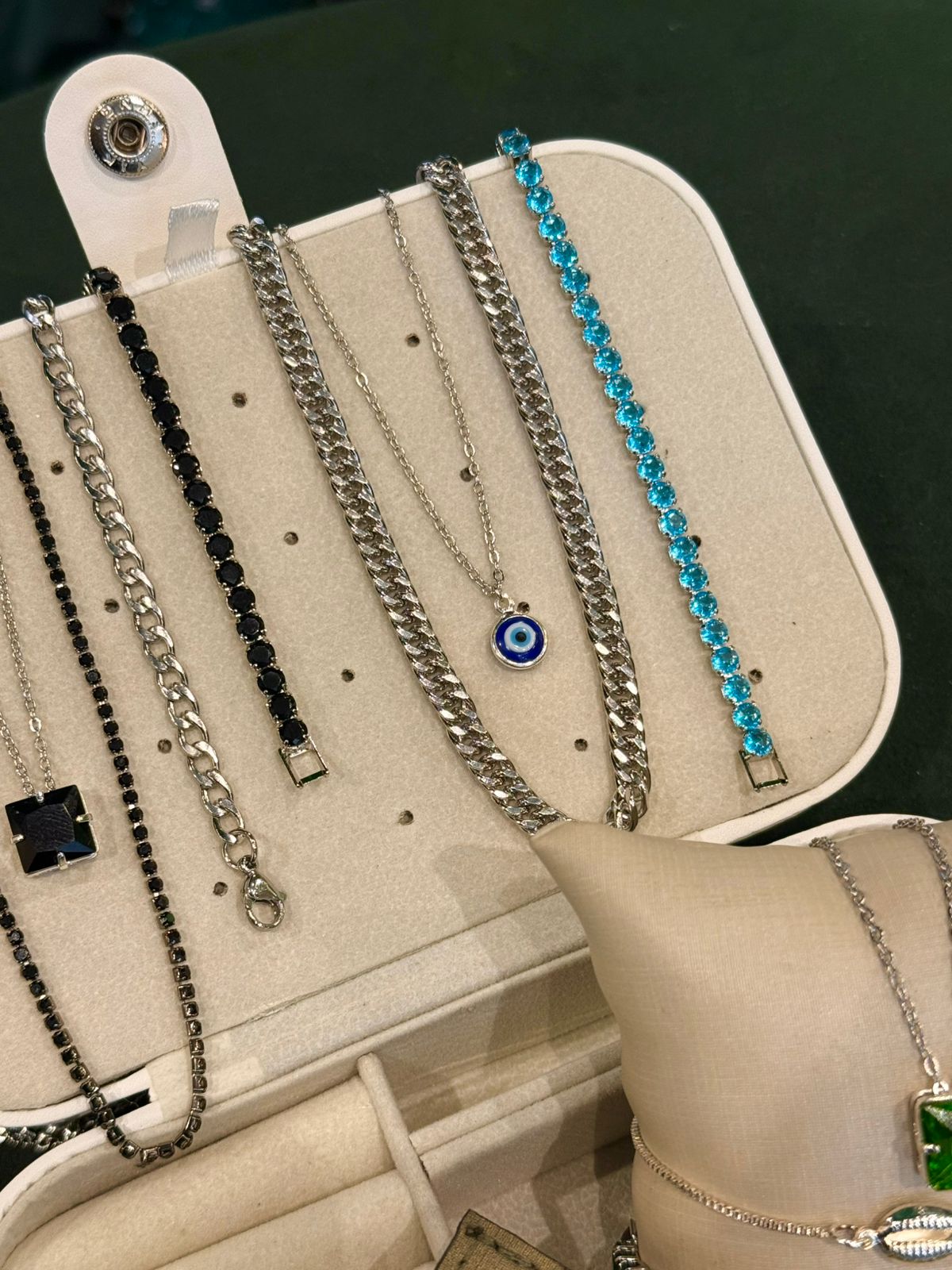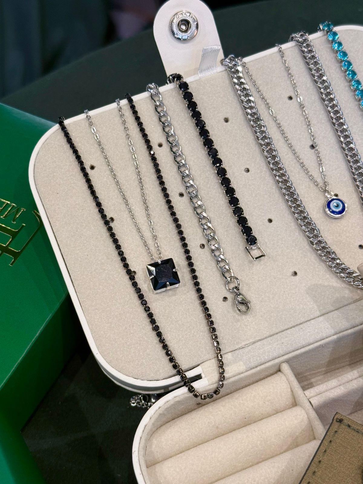 Os materiais variam entre aço inoxidável e semijoias banhadas em ródio (prateado). Peças cravejadas em zircônias de primeira linha, variando entre ônix, verde esmeralda e azul dubai.