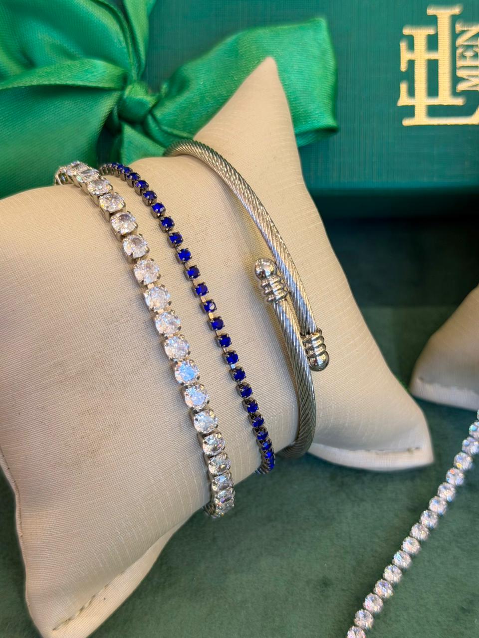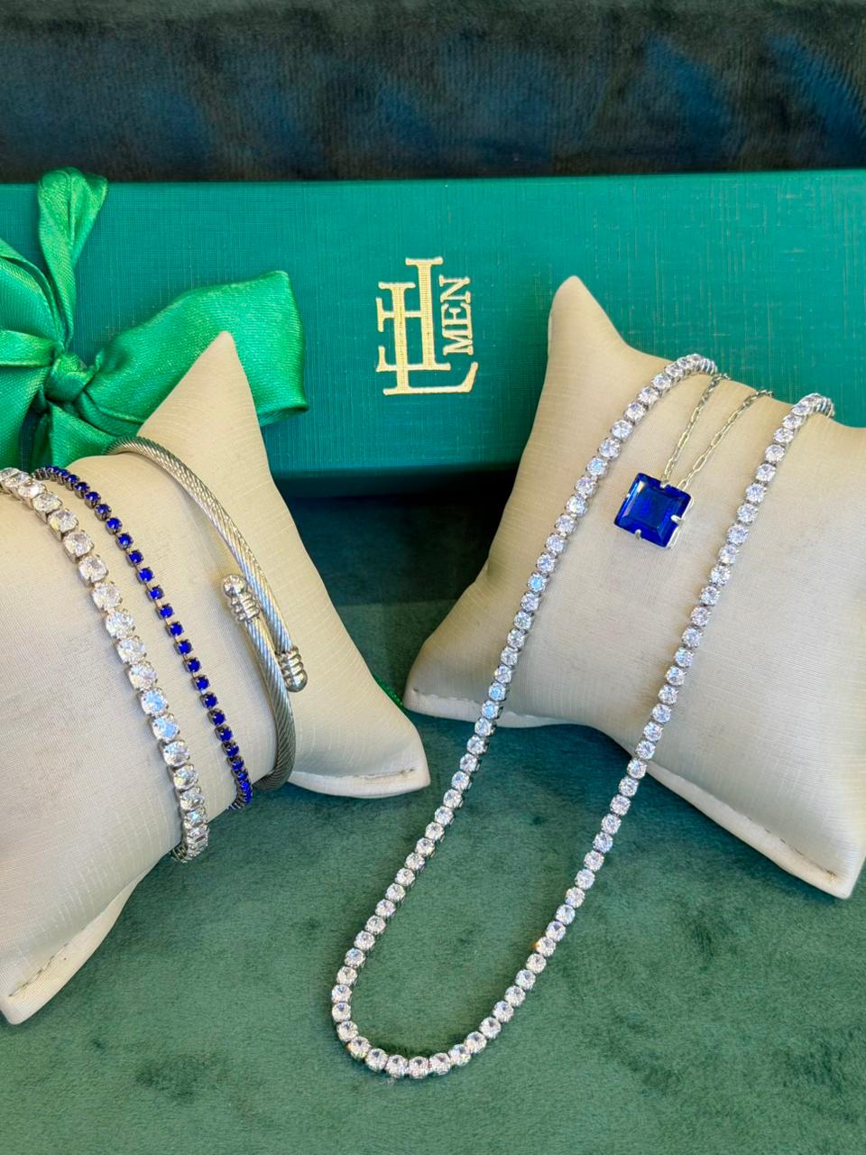 Este kit vai com 5 peças sendo 2 colares e 3 pulseiras. Com peças em aço e semijóias banhadas em ródio e cravejadas com zircônias de primeira linha.