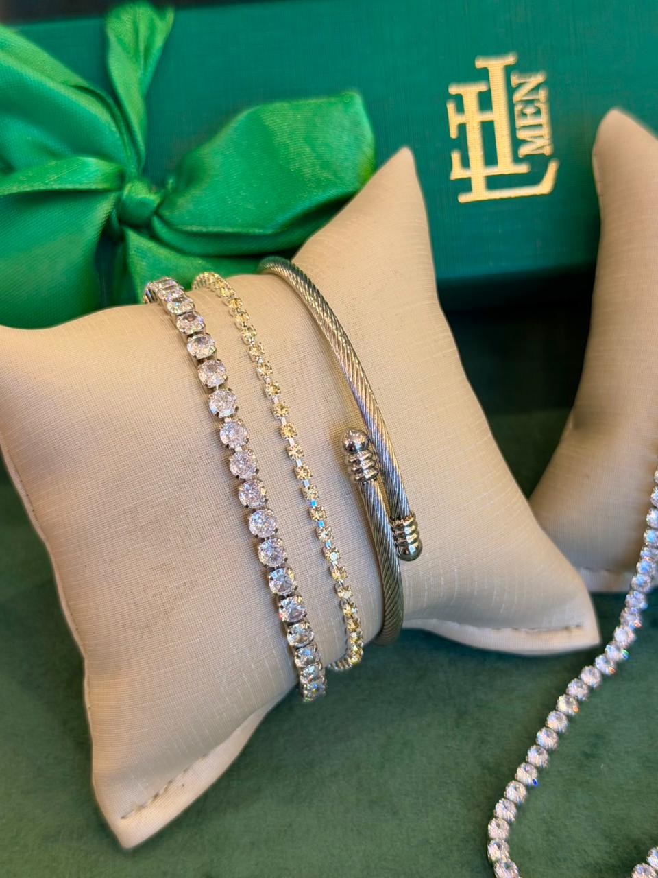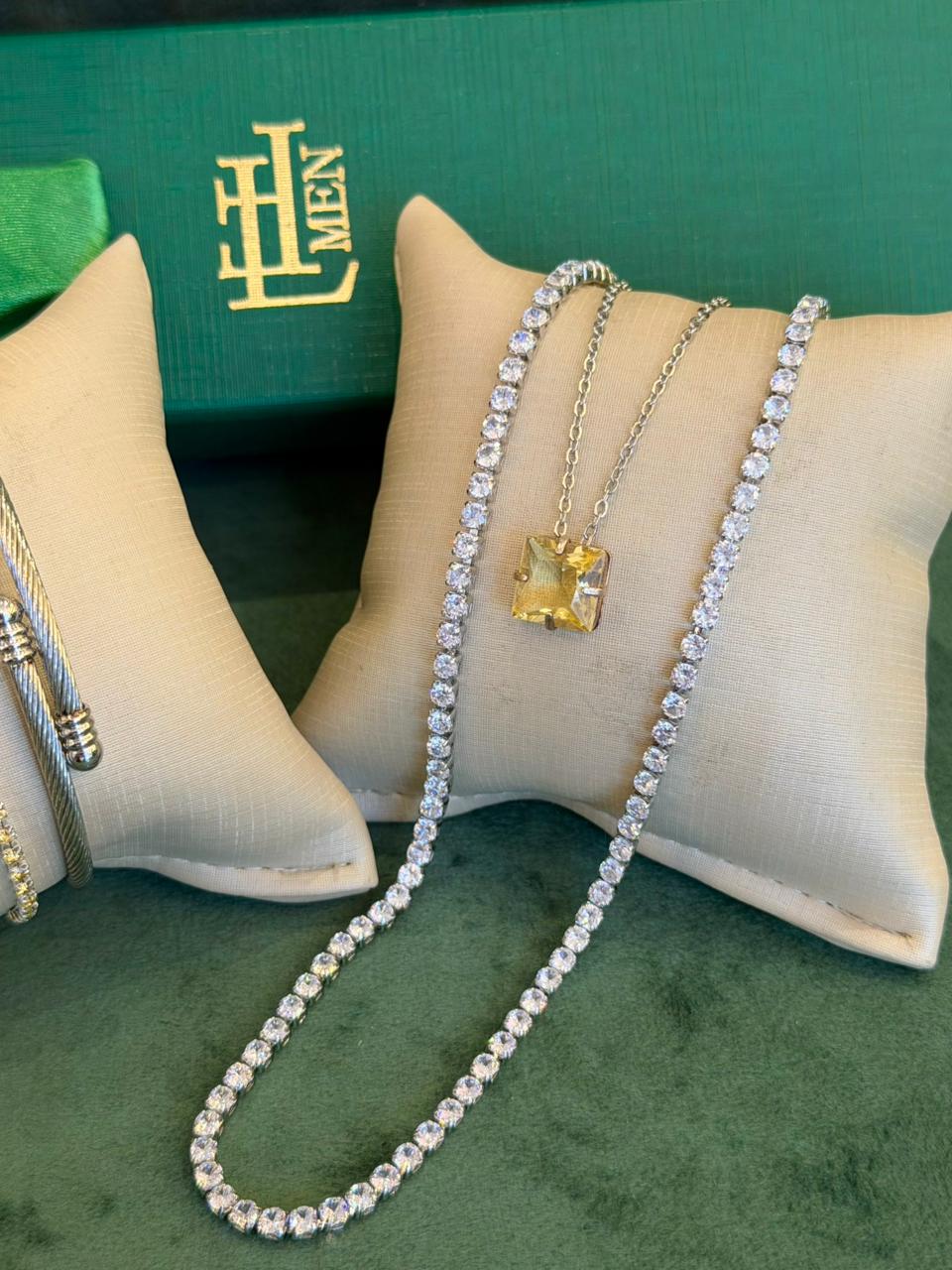 Este kit vai com 5 peças sendo 2 colares e 3 pulseiras. Com peças em aço e semijóias banhadas em ródio e cravejadas com zircônias de primeira linha.