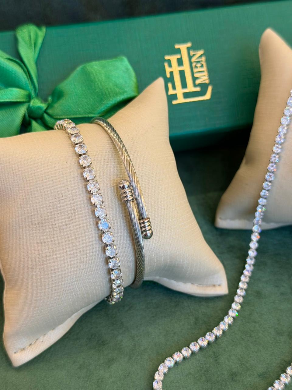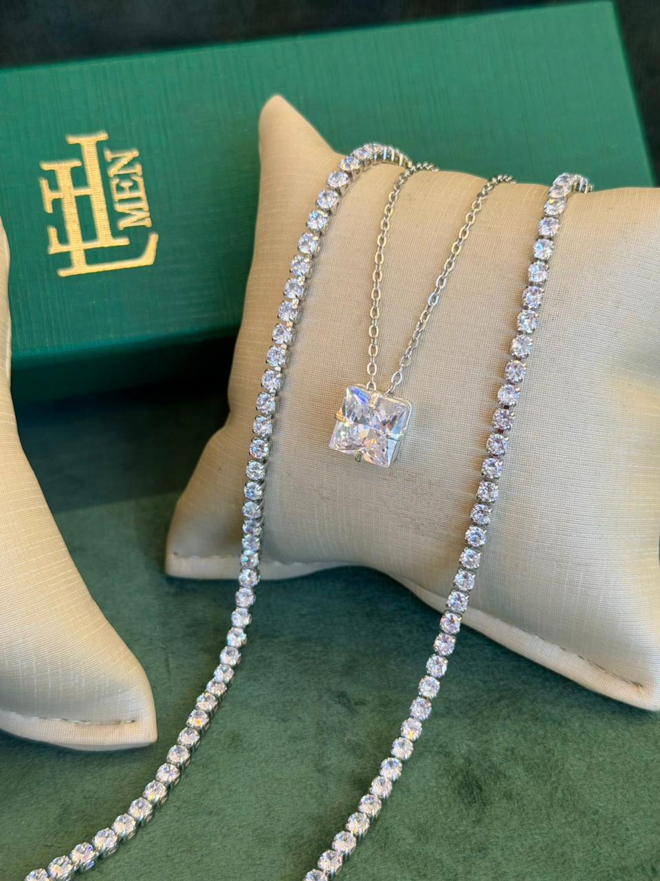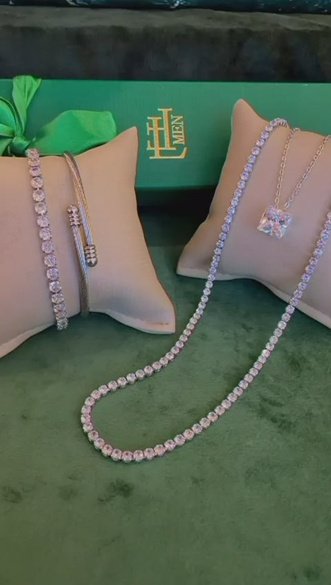 Este kit vai com 4 peças sendo 2 colares e 2 pulseiras. Com peças em aço e semijóias banhadas em ródio e cravejadas com zircônias de primeira linha.