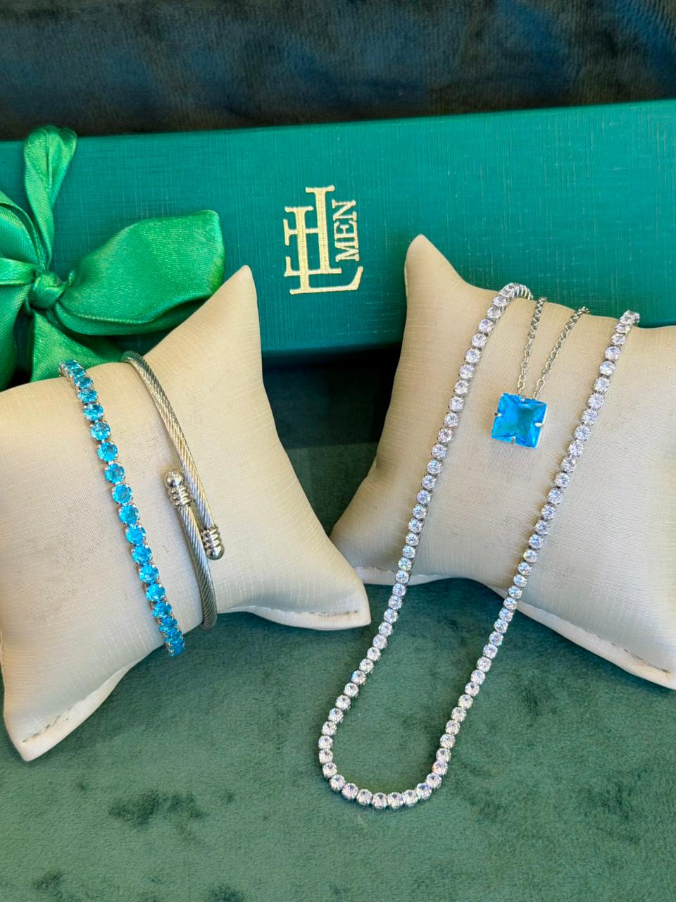Este kit vai com 4 peças sendo 2 colares e 2 pulseiras. Com peças em aço e semijóias banhadas em ródio e cravejadas com zircônias de primeira linha.