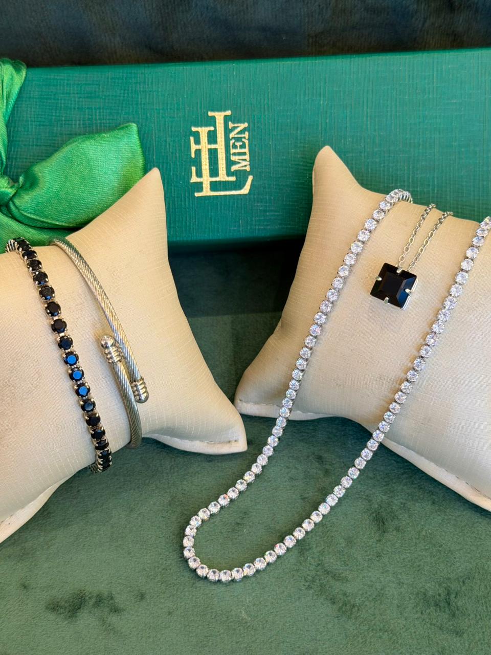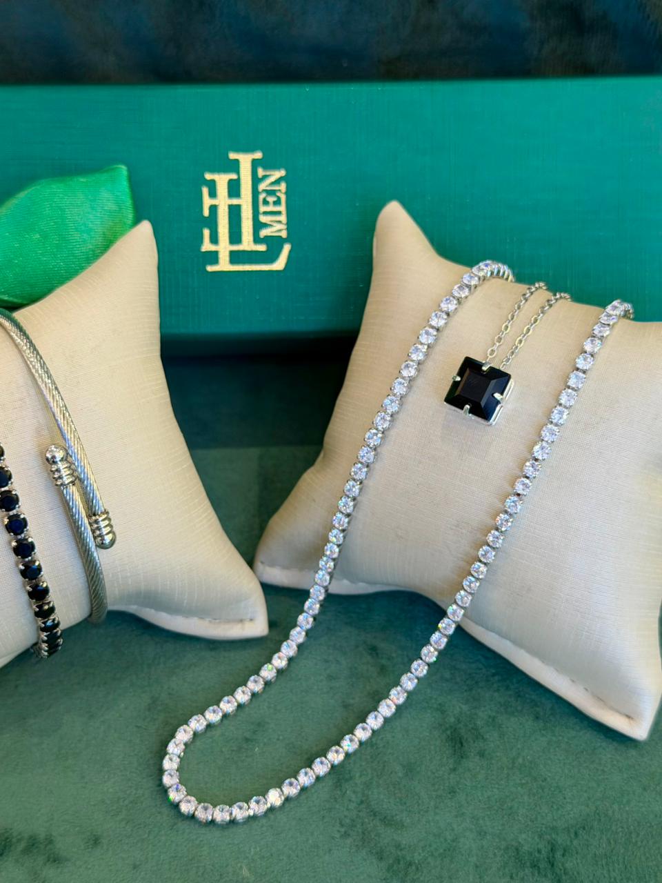 Este kit vai com 4 peças sendo 2 colares e 2 pulseiras. Com peças em aço e semijóias banhadas em ródio e cravejadas com zircônias de primeira linha.