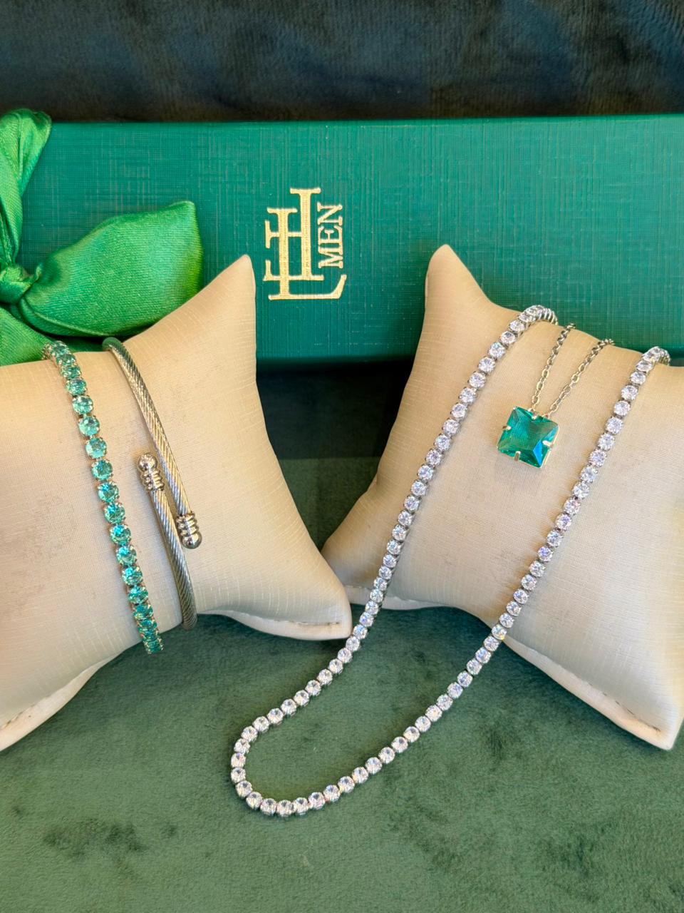 Este kit vai com 4 peças sendo 2 colares e 2 pulseiras. Com peças em aço e semijóias banhadas em ródio e cravejadas com zircônias de primeira linha.
